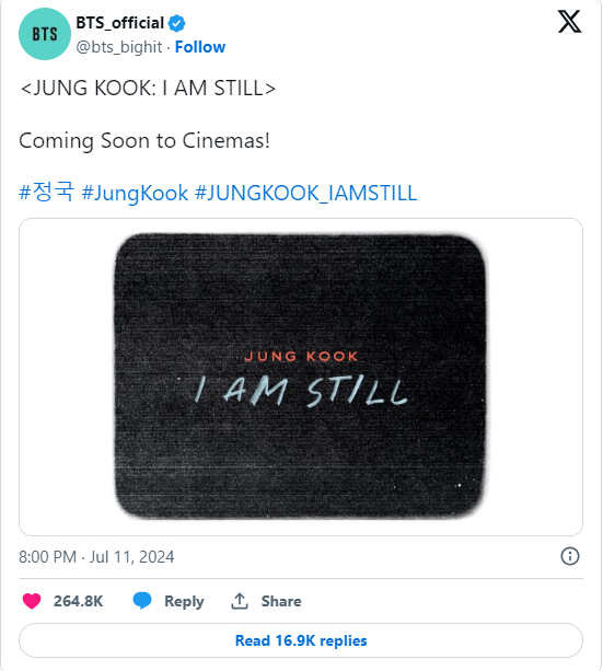 ហើយជាការពិតណាស់ ភាពយន្តឯកសារ ‘I AM STILL’ នេះនឹងក្លាយជាឱកាសឱ្យអ្នកគាំទ្របានឃើញពីជ្រុងថ្មីៗរបស់ Jungkook មិនថាការងារ ឬជីវិតផ្ទាល់ខ្លួន ដែលគ្រប់គ្នាមិនធ្លាប់ឃើញពីមុនមក ដែលអាចឱ្យអ្នកគាំទ្រមានអារម្មណ៍កាន់តែស្និទ្ធស្នាល និងយល់ពីគេកាន់តែច្រើន ដូច្នេះសូមកុំភ្លេចរង់ចាំទស្សនាទាំងអស់គ្នា!