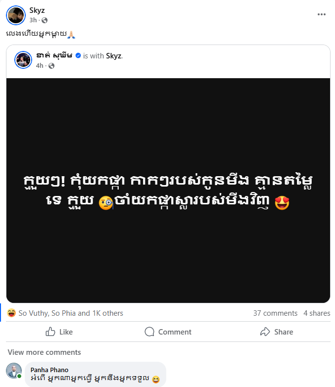 Skyz ដែលជាកូនប្រុសវ័យពេញកំលោះឯណោះវិញ ក៏បាន share បន្តពីអ្នកនាង ខាត់ សុឃីម ផងដែរ ដោយមានជាការឆ្លើយឆ្លង cmt លេងសើចបង្អាប់គ្នារវាងគ្រួសារអ្នកនាង ស្វាមី ព្រមទាំងកូនប្រុសច្បងវ័យជិត២០ ឆ្នាំរូបនេះផងដែរ៕