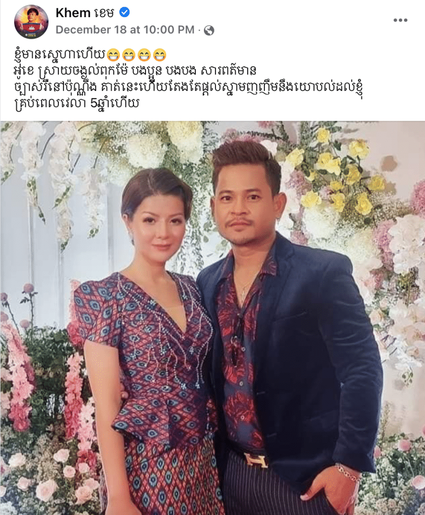 ភ្ជាប់ជាមួយរូបថតជាមួយនារីជាគូស្នេហ៍ មានកាយវិការកៀកកើយយ៉ាងជិតស្និទ្ធស្នាលមួយសន្លឹក ខេម បានរៀបរាប់ថា៖ ខ្ញុំមានស្នេហាហើយ អូខេ ស្រាយចម្ងល់ពុកម៉ែ បងប្អូន បងបង សារពត៍មាន ច្បាស់រឺនៅប៉ុណ្ណឹង គាត់នេះហើយតែងតែផ្តល់ស្នាមញញឹមនឹងយោបល់ដល់ខ្ញុំគ្រប់ពេលវេលា ៥ឆ្នាំហើយ»។