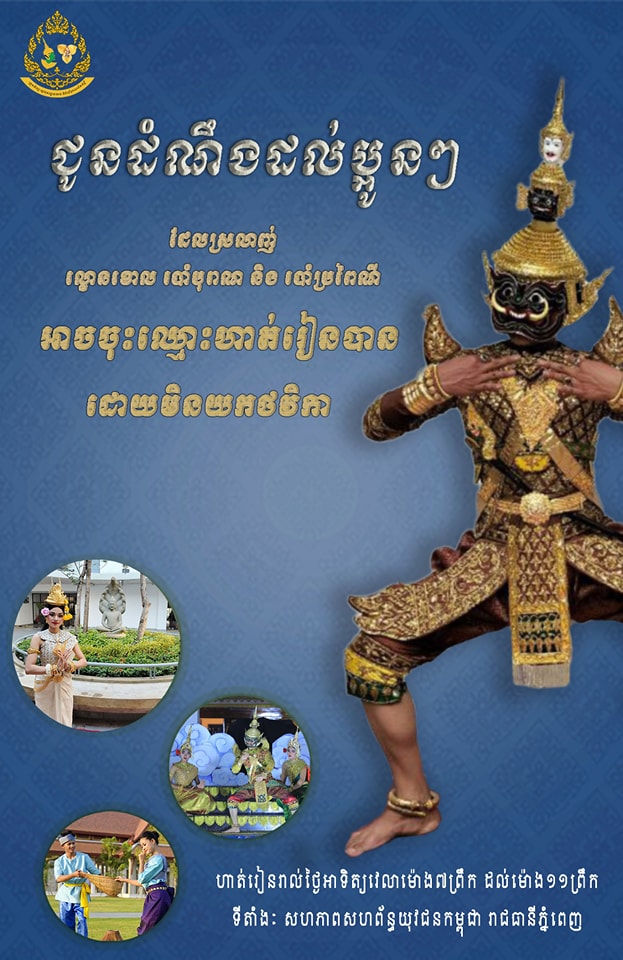 សម្រាប់យុវជន យុវនារី ដែលស្រលាញ់សិល្បៈវប្បធម៌ខ្មែរ នេះជាឱកាសនៃការចាប់យកចំណេះ ជំនាញ និងបំពេញក្ដីស្រមៃបានមកដល់ហើយ។ តាមរយៈផេក នាដក ហង់ភូមិរ៉ា- យាយកន្តែរ៉ែ បានបង្ហោះជ្រើសរើសយុវជន យុវនារី ហាត់រៀនរបាំបុរាណ របាំប្រពៃណី ល្ខោនខោល ដោយមិនយកថវិកានោះទេ។