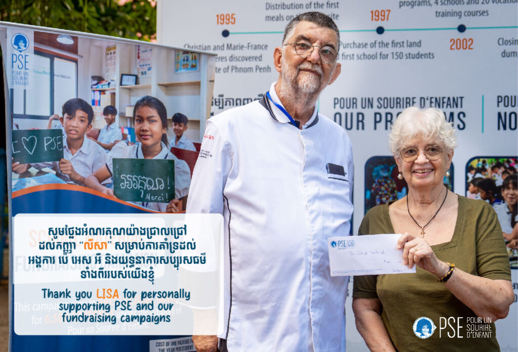 នៅថ្ងៃទី ១៣ ខែ វិច្ឆិកា ឆ្នាំ ២០២៣ យោងតាមផេកហ្វេសបុកផ្លូវការរបស់អង្គការ ប៉េ អេស អឺ PSE – Pour un Sourire d’Enfant – Cambodia បានបង្ហោះសារមួយដែលមានខ្លឹមសារបញ្ជាក់ពីសមាជិកក្រុមចម្រៀងល្បី BLACKPINK គឺ Lisa បានផ្ញើសារជូនដល់អ្នកគាំទ្រកម្ពុជា និងផ្ដល់ជំនួយផ្ទាល់ខ្លួនទៅកាន់យុទ្ធនាការសប្បុរសធម៌ផងដែរ។ សម្រាប់ខ្លឹមសារនៃការផ្ញើសារជូនពរដល់អ្នកគាំទ្រកម្ពុជាមានដូចតទៅ៖