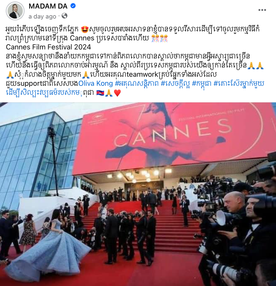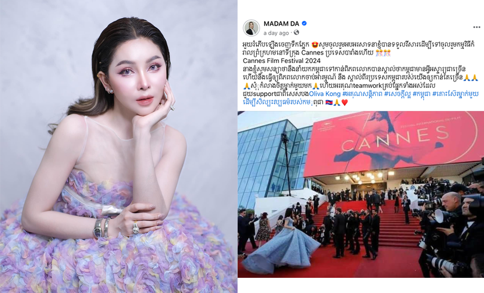 ម៉ាដាម រៀបរាប់ឡើងថា «អួយរំភើបឡើងចេញទឹកភ្នែក សូមចូលរួមអបអរសាទនាខ្ញុំបានទទួលវីសារដើម្បីទៅចូលរួមកម្មវិធីកំរាលព្រំក្រហមនៅទីក្រុង Cannes ប្រទេសបារាំងហើយ Cannes Film Festival 2024 នាងខ្ញុំសូមសន្យាថានឹងនាំយកកម្ពុជាទៅកាន់ពិភពលោកបានស្គាល់ថាកម្ពុជាមានអ្វីអស្ចារ្យជាច្រើនហើយនឹងធ្វើឲ្យពិភពលោកចាប់អារម្មណ៍ នឹង ស្គាល់ពីរប្រទេសកម្ពុជារបស់យើងឲ្យកាន់តែច្រើន សុំុកំលាងចិត្តម្នាក់មួួយមក ហើយអរគុណteamworkគ្រប់ផ្នែកទាំងអស់ដែលជួយsupportជាពិសេសបងOliva Kong»។