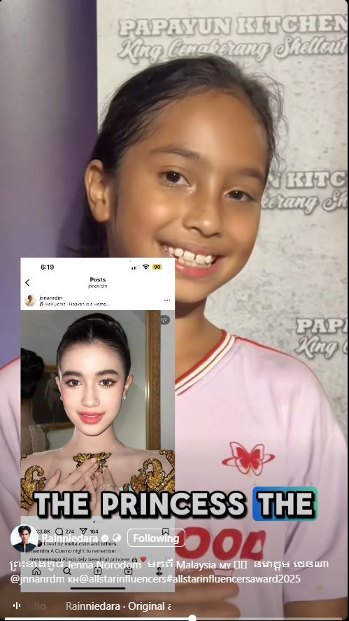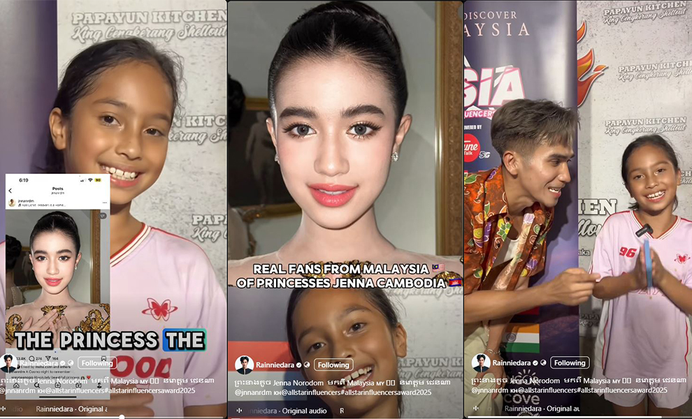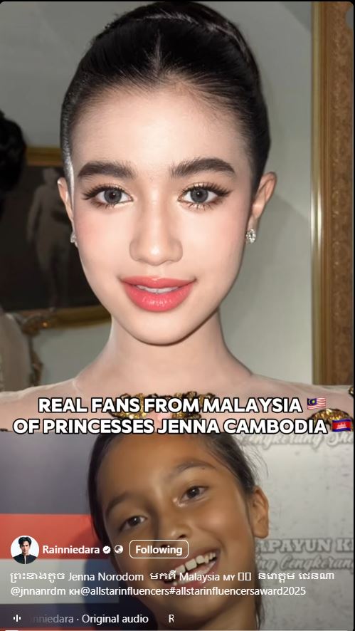 ក្មេងស្រីជនជាតិម៉ាឡេស៊ីម្នាក់បានបង្ហាញកាយវិការដ៏គួរឱ្យស្រលាញ់ ក្នុងនាមជាអ្នកគាំទ្រព្រះនាង នរោត្តម ជេនណា។ នេះបើតាមរយៈវីដេអូមួយដែលបង្ហោះដោយអ្នកផលិតមាតិកាកម្ពុជា Rainniedara នាកម្មវិធី all star influencers របស់ប្រទេសម៉ាឡេស៊ី។