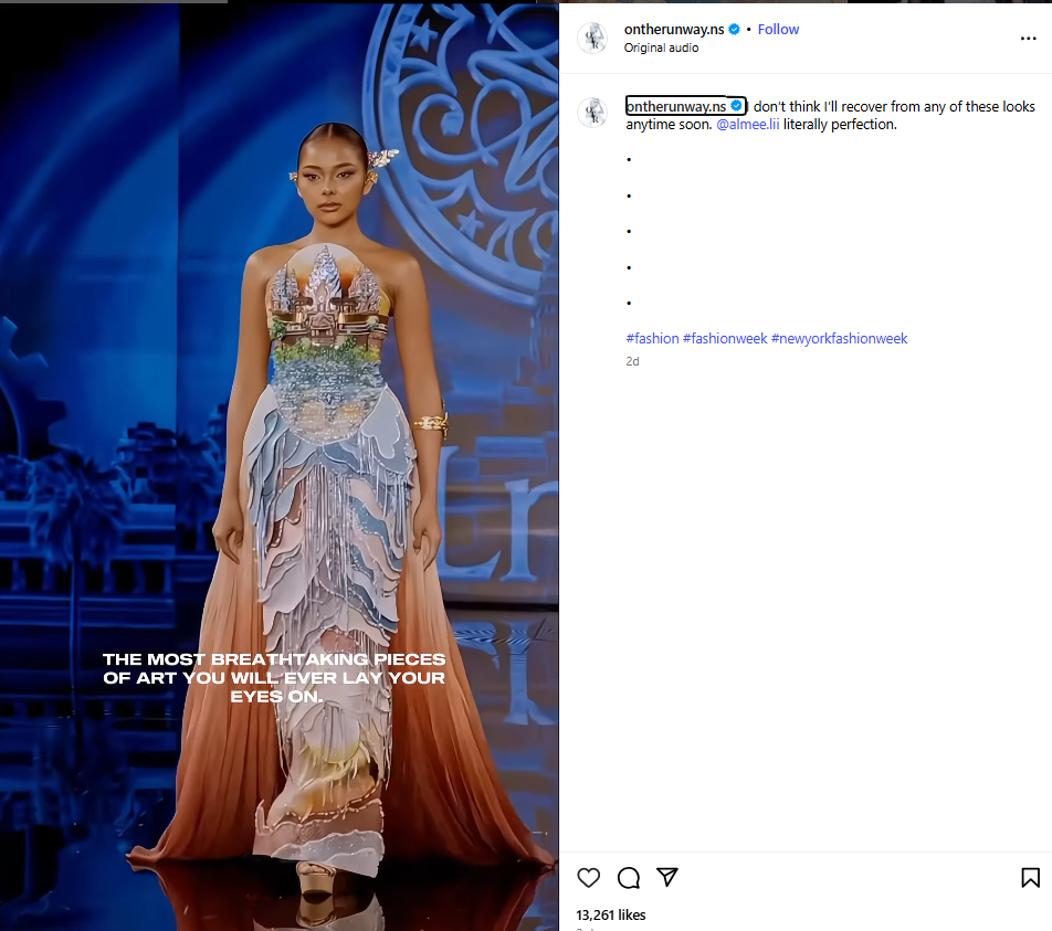 ងាកទៅមើល On The Runway ដែលមាន Follower លើ Instagram ជាង 293K និងជាអ្នកជំនាញនិយាយពី Fashion បានដាក់ចំណងជើងលើវីដេអូខ្លួនថា “ស្នាដៃសិល្បៈដ៏អស្ចារ្យបំផុត ដែលអ្នកមិនធ្លាប់បានឃើញ ”។