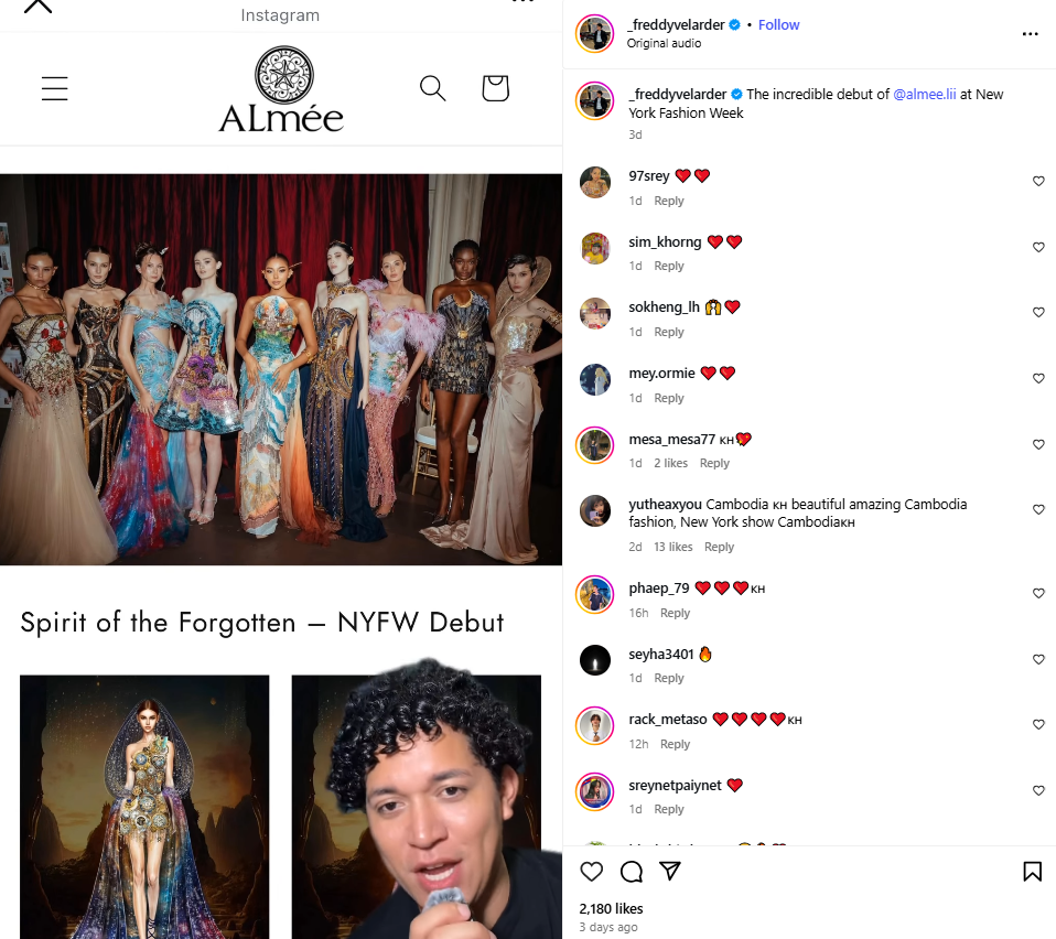 ក្នុងនោះមានលោក Freddy Velarder អ្នកបង្កើតមាតិកាលើឌីជីថល ហើយក៏ជាអ្នកស្រលាញ់ផ្នែក Fashion បានឃើញពីភាពប្រណីតនៃប្រេនកូនខ្មែរមួយនេះច្បាស់ពេញៗភ្នែក ហើយនិយាយថា លោកគ្មានពាក្យបរិយាយពីប្រេនខ្មែរមួយនោះឡើយ ហើយលោកក៏បានអធិប្បាយពីឈុតនីមួយៗរបស់ ALmée Couture ដែរ។ Freddy Velarder ចាប់អារម្មណ៍ខ្លាំងបំផុតលើឈុត Time Voyage ដើរបង្ហាញម៉ូដដោយ Mélia Constantin។