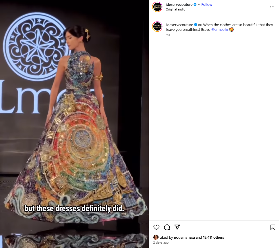ចំណែក Instagram ដែលមានឈ្មោះI deserve Couture មានអ្នក Follow ដល់ទៅជាង ៥ សែននាក់ បានរៀបរាប់ពីភាពអស្ចារ្យនៃឈុតនីមួយៗរបស់ ALmée Couture ថា “ខ្ញុំកម្រឃើញម៉ូដសម្លៀកបំពាក់ដែលធ្វើឲ្យខ្ញុំស្ទើរតែភ្លេចដកដង្ហើម ប៉ុន្តែរ៉ូបទាំងនោះប្រាកដជាធ្វើបាន។ ស្នាដៃសិល្បៈទាំងនោះ គឺជាស្នាដៃរបស់ ALmée Couture ដែលជាម៉ាកយីហោរបស់កម្ពុជា ដែលបង្កើតរឿងរ៉ាវជាច្រើន មិនត្រឹមតែជាសម្លៀកបំពាក់ប៉ុណ្ណោះទេ។ សម្លៀកបំពាក់ទាំងនោះនិយាយអំពីសារៈសំខាន់នៃពេលវេលា និងជាសម្លៀកបំពាក់ដែលជាកិត្តិយសដល់ប្រទេសកម្ពុជា ហើយប្រាប់ពីរឿងរ៉ាវនៃភាពស្រស់ស្អាតរបស់ប្រទេស។ ប៉ុន្តែសូមចំណាយពេលមួយភ្លែត ហើយក្រឡេកមើលបំណែកតូចៗទាំងអស់ នោះអ្នកនឹងឃើញថាតើការខិតខំប្រឹងប្រែង និងការលះបង់ច្រើនប៉ុណ្ណា ក្នុងការបង្កើតម៉ូដសម្លៀកបំពាក់ ដែលលើសពីសម្លៀកបំពាក់។ Fashion មានន័យថាជាអ្វីមួយ ហើយនៅទីបញ្ចប់នៃថ្ងៃ, Fashion ដែលនឹងធ្វើឲ្យស្ទើរតែភ្លេចដកដង្ហើម”។