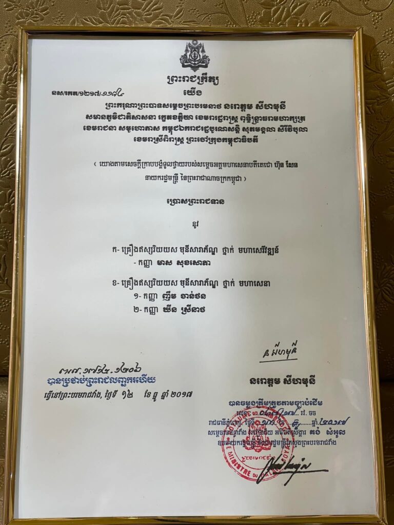 បន្ទាប់ពីបានចំណាយកម្លាំងកាយចិត្ត និងពេលវេលាជាច្រើនឆ្នាំចូលរួមលើកកម្ពស់សកម្មភាពមនុស្សធម៌នៅក្នុងសង្គម ពិសេសជុំវិញការជំរុញ និងផ្សព្វផ្សាយឲ្យមហាជនបានយល់ពីបញ្ហាអំពើពុករលួយ តារាចម្រៀងស្រី៣រូប រួមមាន កំពូលតារាចម្រៀងស្រីលំដាប់ប្រទេស កញ្ញា មាស សុខសោភា តារាចម្រៀង និងជាតារាសម្តែង ញឹម ចាន់ថន និងតារាចម្រៀងប្រចាំផលិតកម្មសាន់ដេ កញ្ញា ឃីន ស្រីនាថ ហៅ អ៊ីវ៉ា ថ្មីៗនេះ មានកិត្តិយសទទួលបានគ្រឿងឥស្សរិយយស មេដាយមុនីសារាភ័ណ្ឌ ពីព្រះករុណា ព្រះបាទសម្តេចព្រះបរមនាថ នរោត្តម សីហមុនី ជាអម្ចាស់ជីវិតលើត្បូង ព្រះមហាក្សត្រនៃព្រះរាជាណាចក្រកម្ពុជា ជាទីគោរពសក្ការៈដ៏ខ្ពង់ខ្ពស់បំផុត ដោយយោងតាមសេចក្តីប្រកាសក្រាបបង្គំទូលថ្វាយរបស់សម្តេចអគ្គមហាសេនាបតីតេជោ ហ៊ុន សែន នាយករដ្ឋមន្ត្រី នៃព្រះរាជាណាចក្រកម្ពុជា។