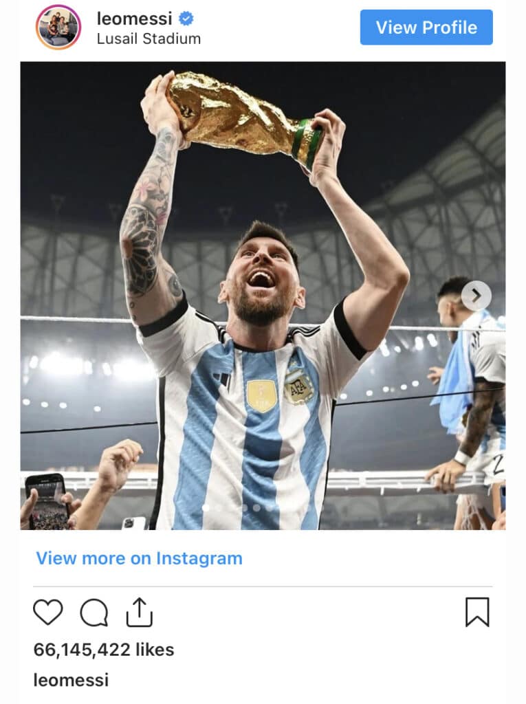 នៅព្រឹកថ្ងៃទី ២១ ខែ ធ្នូ ឆ្នាំ ២០២២ លោក Mark Zuckerberg ស្ថាបនិក Facebook និងជាម្ចាស់ក្រុមហ៊ុន Instagram បានឲ្យដឹងថា៖ រូបភាព Messi ក្នុងព្រឹត្តិការណ៍ World Cup ឆ្នាំ ២០២២ បំបែកកំណត់ត្រាមានអ្នកចុច like ច្រើនបំផុតជាង ៦៦ លានដង ក្នុងបណ្ដាញសង្គម IG ខណៈចំនួនអ្នក like នៅតែបន្ដកើនឡើងជាលំដាប់។