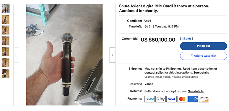 ថ្មីៗនេះក្បាលមីក្រូហ្វូនដែលតារារ៉េបស្រី Cardi B បានគប់ទៅលើទស្សនិកជន ត្រូវបានគេរើសយក និងដាកដេញថ្លៃដើម្បីយកទៅធ្វើសប្បុរសធម៌នៅក្នុងទីក្រុង Las Vegas សហរដ្ឋអាមេរិក។ រឿងហេតុនេះបានកើតឡើងនៅពេលដែលអ្នកគាំទ្រម្នាក់បានជះស្រានៅសល់ពាក់កណ្ដាលរបស់នាង ទៅលើតារាស្រីរូបនេះអំឡុងការសម្ដែងបទ Bodak Yellow ហើយធ្វើឱ្យនាងខឹងយ៉ាងខ្លាំង។