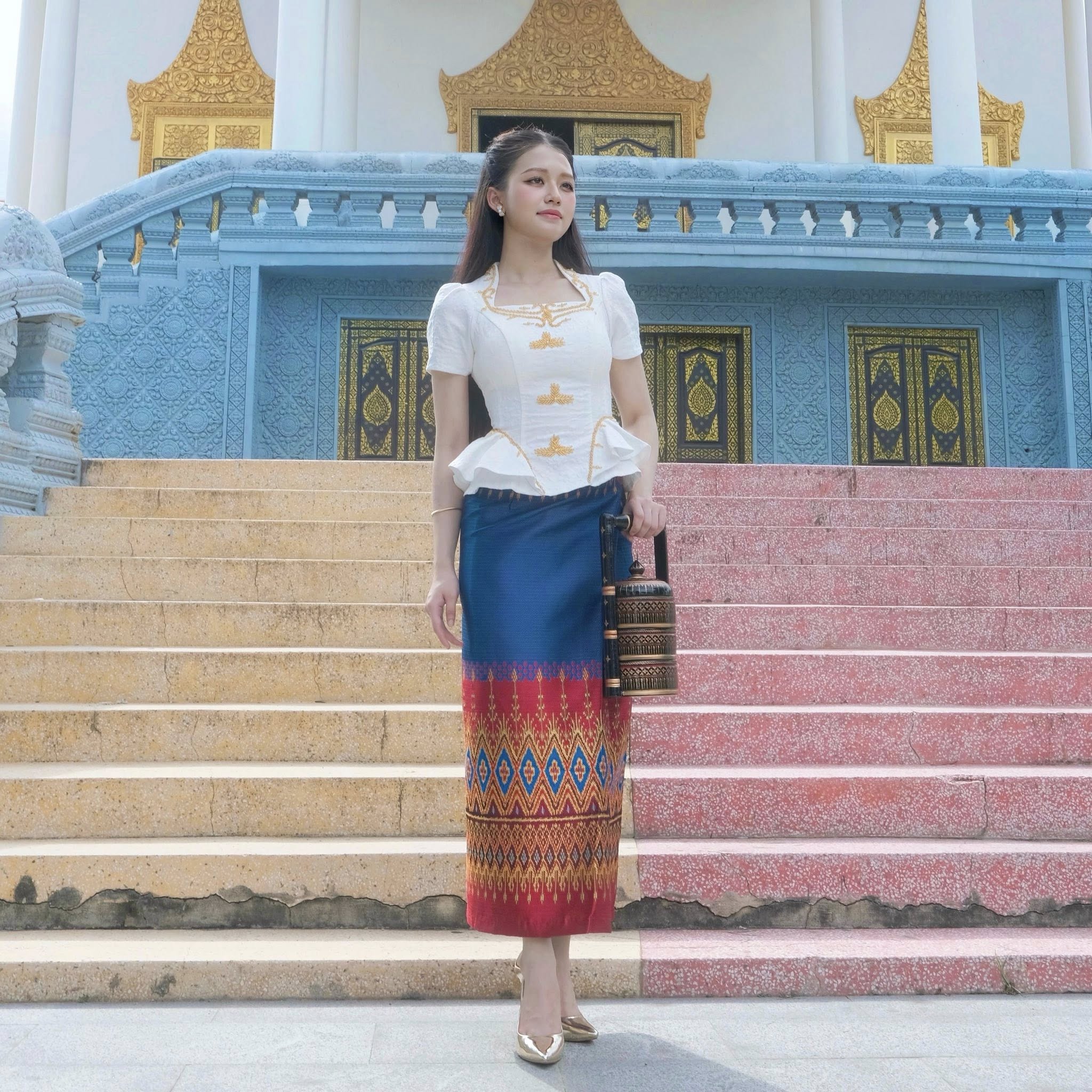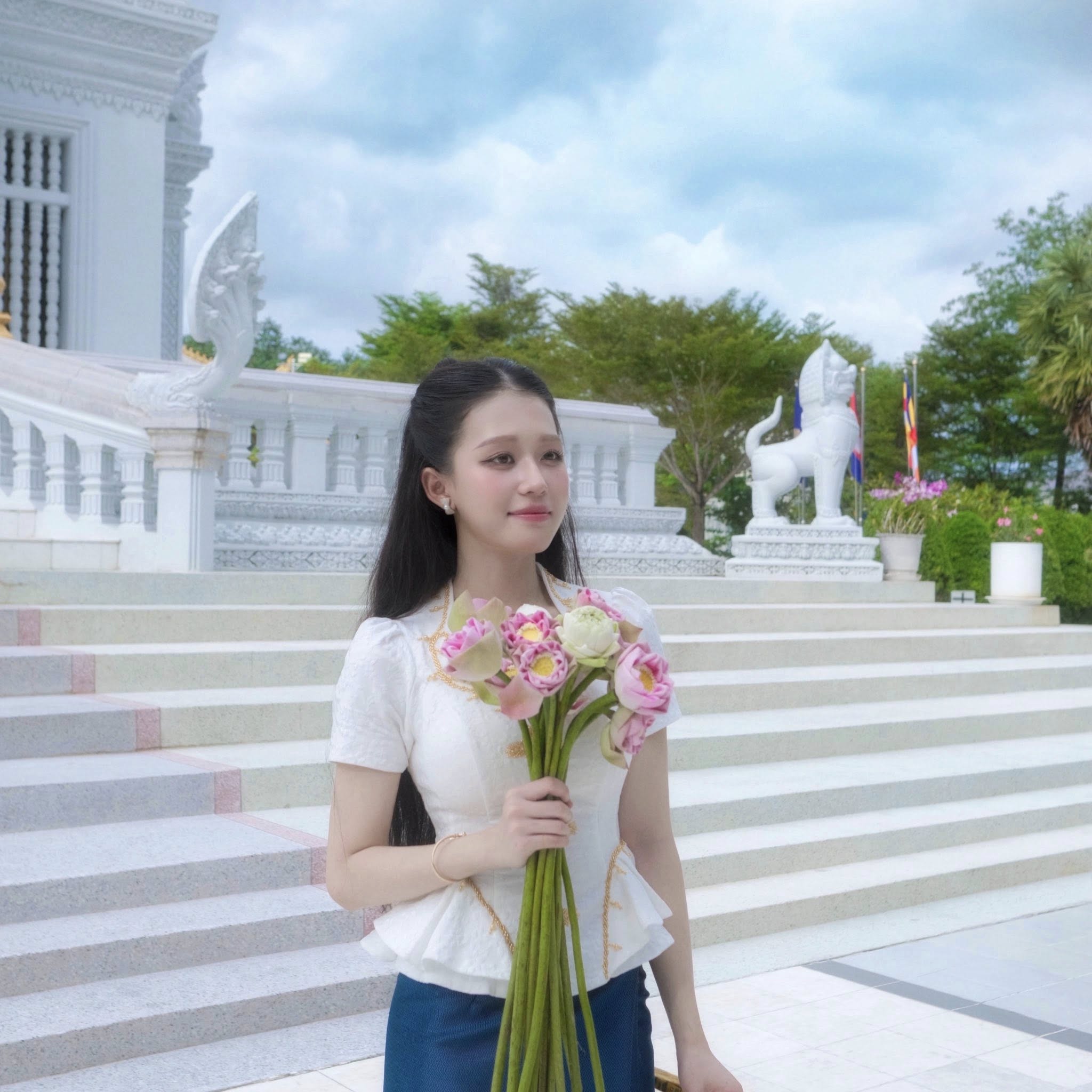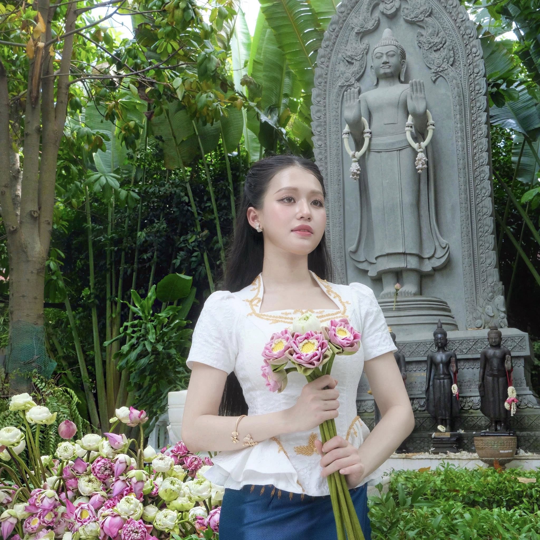 ស្ថិតក្នុងសម្លៀកបំពាក់ប្រពៃណីខ្មែរ សំពត់ហូល អាវពាក់ ដៃកាន់ចានស្រាក់ និងផ្កាឈូក ព្រមជាមួយការលើកសក់ពាក់កណ្ដាល សមសួនខ្លាំងតែម្ដង។ មីណា ជាតារាស្រីដែលមានសម្រស់ស្រស់ស្អាតស្រាប់ ហើយទោះជាតែងខ្លួនក្នុងសម្លៀកបំពាក់បែបណា ក៏ទទួលបានការចាប់អារម្មណ៍ច្រើនពីមហាជនដែរ។