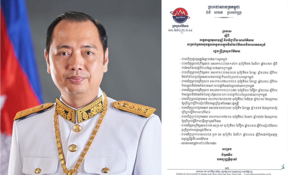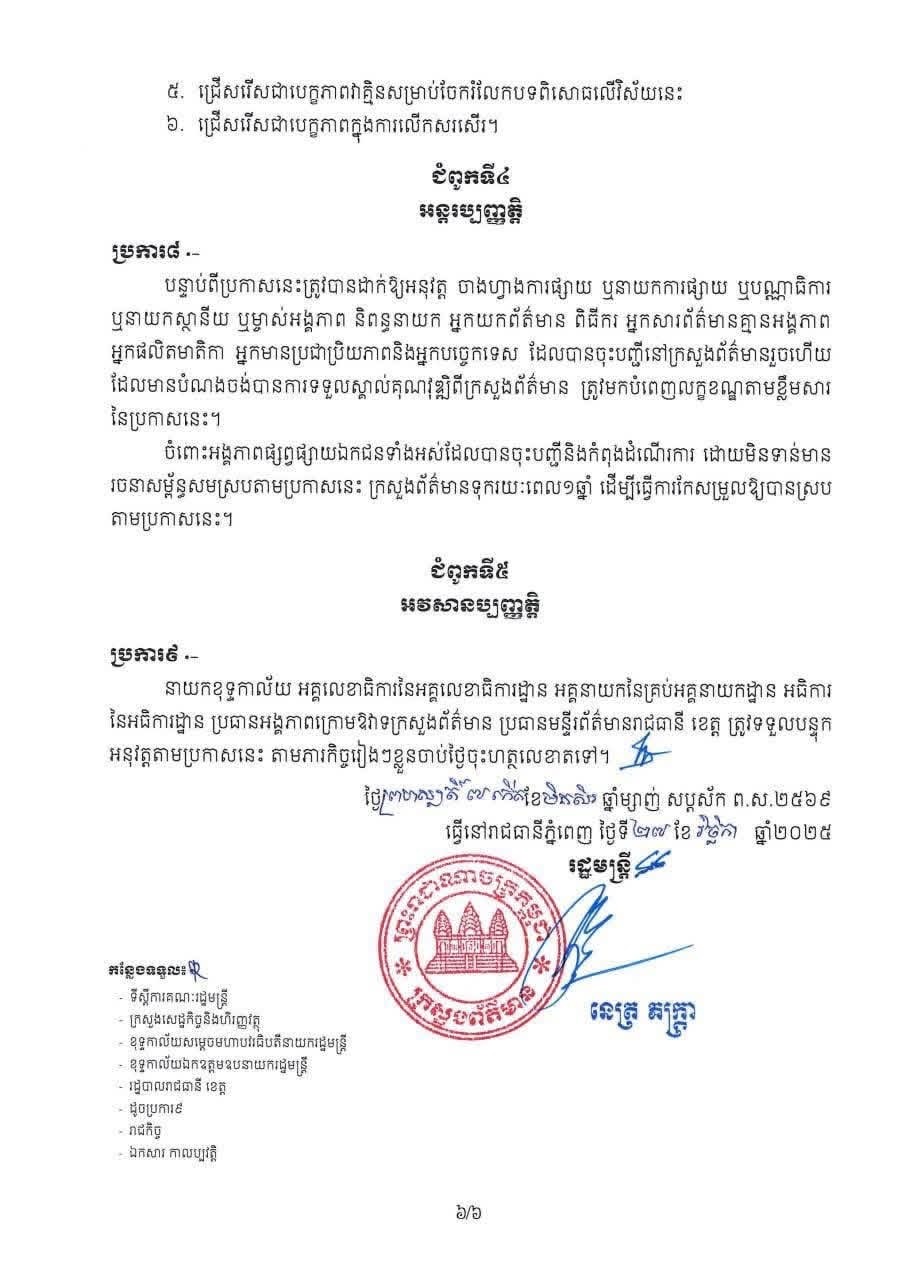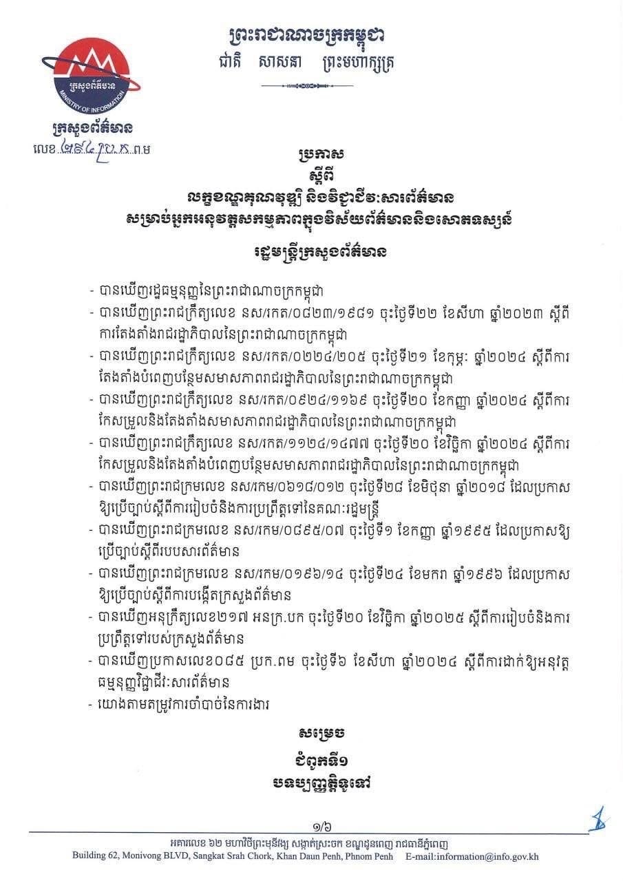 នៅថ្ងៃទី២៧ ខែវិច្ឆិកា នេះ ក្រសួងព័ត៌មានបានចេញសេចក្ដីប្រកាសស្តីពី “លក្ខខណ្ឌគុណវុឌ្ឍិ និងវិជ្ជាជីវៈសារព័ត៌មានសម្រាប់អ្នកអនុវត្តសកម្មភាពក្នុងវិស័យព័ត៌មាននិងសោតទស្សន៍” ដោយកំណត់ឱ្យអ្នកសារព័ត៌មានគ្មានអង្គភាព អ្នកផលិតមាតិកា និងអ្នកមានប្រជាប្រិយភាព ត្រូវមានវិញ្ញាបនបត្របញ្ជាក់ការសិក្សាវិជ្ជាជីវៈសារព័ត៌មាន និងបទពិសោធន៍ប្រឡូកក្នុងវិស័យនេះ។