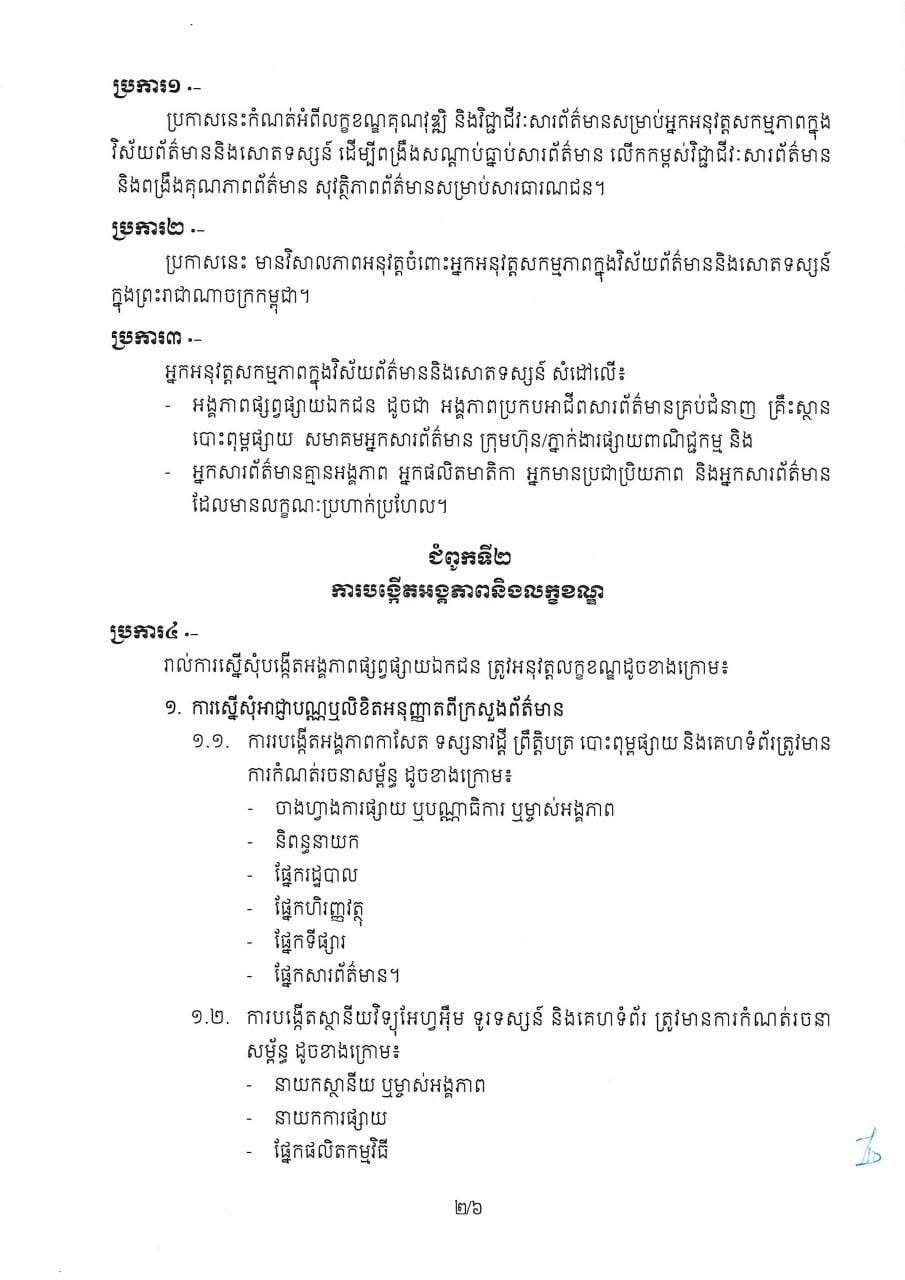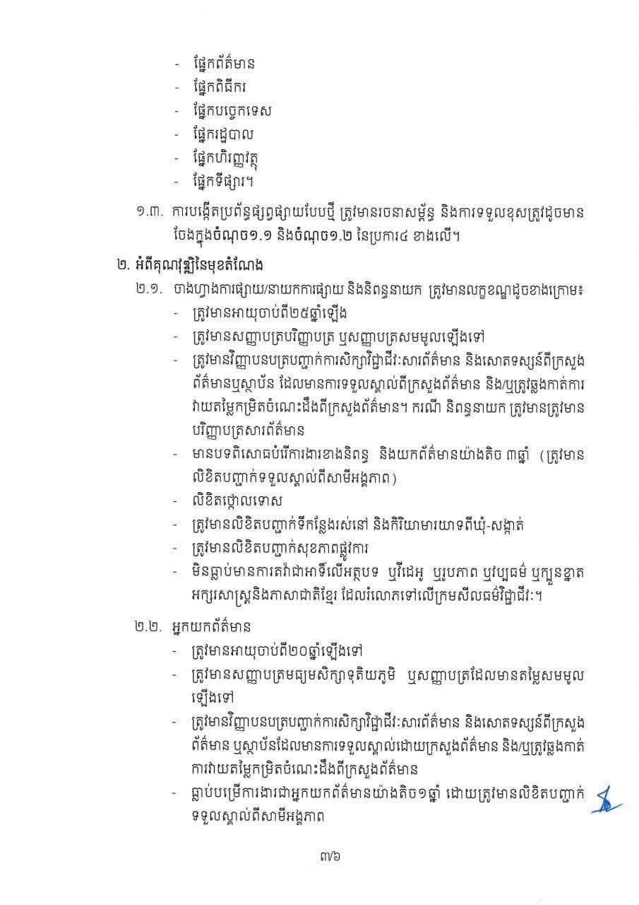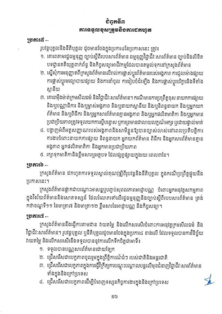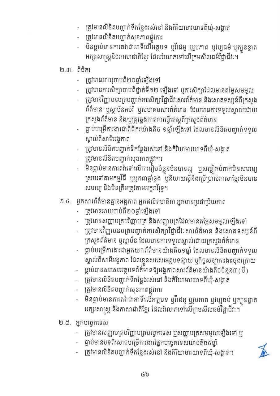 បន្ថែមពីនេះ អ្នកសារព័ត៌មានគ្មានអង្គភាព អ្នកផលិតមាតិកា និងអ្នកមានប្រជាប្រិយភាពក៏តម្រូវឱ្យមានលិខិតបញ្ជាក់ទីកន្លែងរស់នៅ និងកិរិយាមារយាទពីឃុំ-សង្កាត់ រួមទាំងមានលិខិតបញ្ជាក់សុខភាពផ្លូវការ និងមិនធ្លាប់មានការតវ៉ាជាអាទិ៍លើអត្ថបទ ឬវីដេអូ ឬរូបភាព ឬវប្បធម៌ ឬក្បួនខ្នាត អក្សរសាស្ត្រ និងភាសាជាតិខ្មែរ ដែលរំលោភទៅលើក្រមសីលធម៌វិជ្ជាជីវៈ៕
