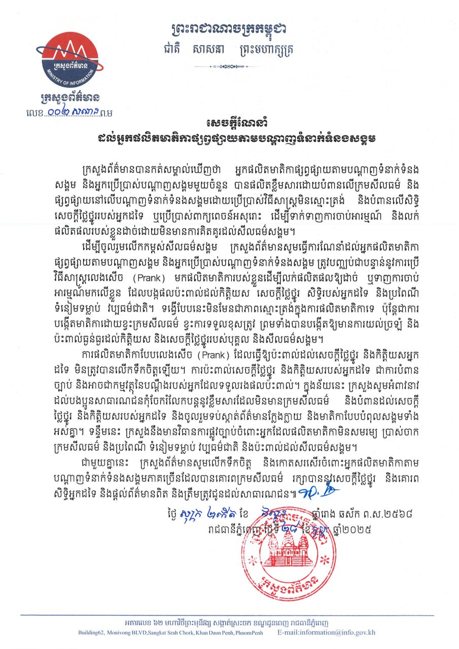 ក្រសួងព័ត៌មាន បានកត់សម្គាល់ឃើញថា មានអ្នកផលិតមាតិកាផ្សព្វផ្សាយតាមបណ្ដាញទំនាក់ទំនងសង្គម និងអ្នកប្រើប្រាស់បណ្ដាញសង្គមមួយចំនួន បានផលិតវីដេអូមានខ្លឹមសារបំពានក្រមសីលធម៌ និង ផ្សព្វផ្សាយនៅលើបណ្ដាញទំនាក់ទំនងសង្គមដោយប្រើប្រាស់វិធីសាស្ត្រមិនស្មោះត្រង់ និងបំពានលើសិទ្ធិ សេចក្ដីថ្លៃថ្នូររបស់អ្នកដទៃ ឬប្រើប្រាស់ពាក្យពេចន៍អសុរោះ ដើម្បីទាក់ទាញការចាប់អារម្មណ៍ និងលក់ផលិតផលរបស់ខ្លួនដាច់ ដោយមិនមានការគិតគូរដល់សីលធម៌សង្គម។
