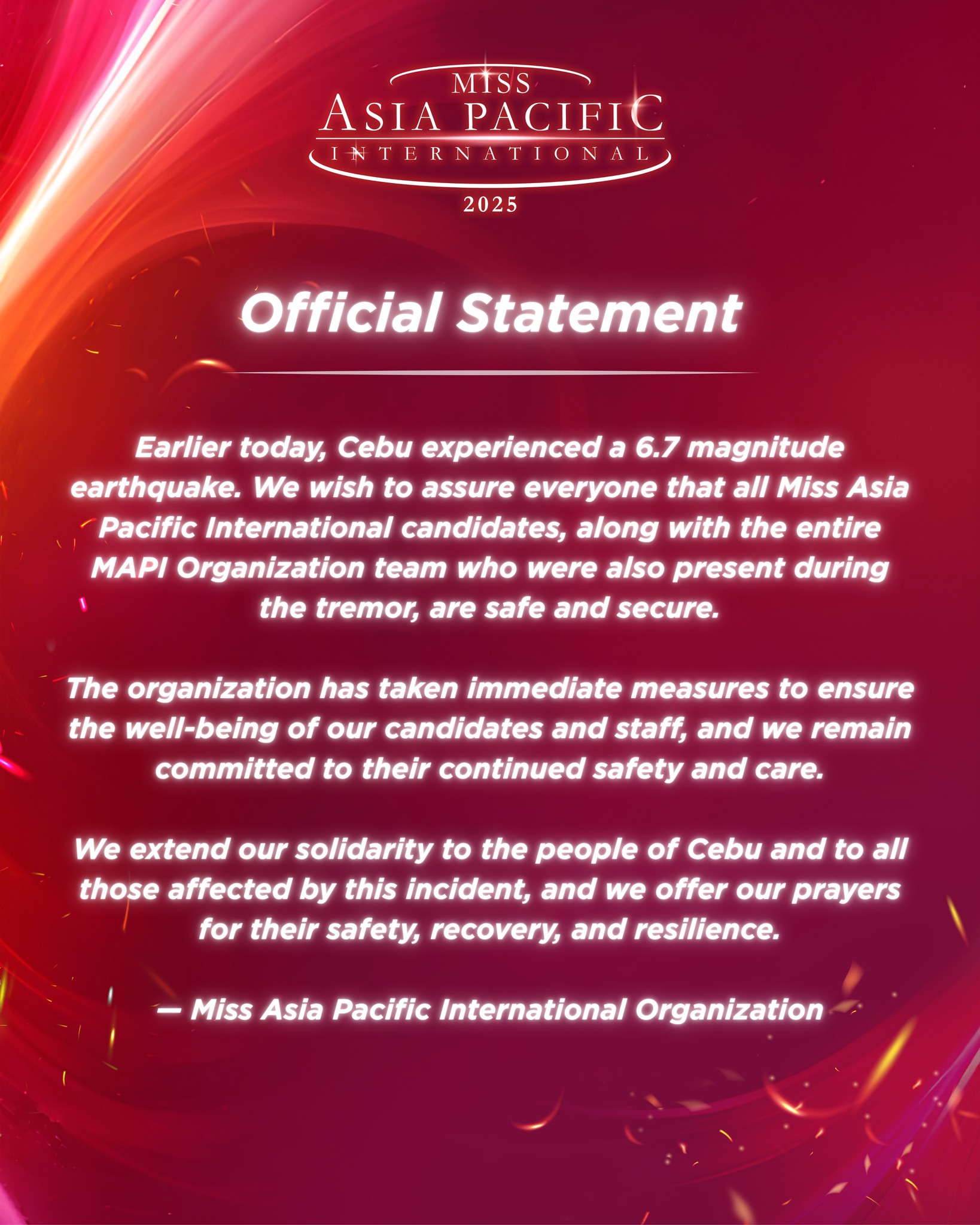 កាលពីយប់មិញហេតុការណ៍រញ្ជួយដីក្នុងកម្រិត ៦.៧ វ៉ិចទ័រ បានកើតឡើងក្នុងអំឡុងពេលប្រកួត Miss Asia Pacific International 2025 ក្នុងទីក្រុង Cebu ប្រទេសហ្វីលីពីន ក្នុងនោះកម្ពុជាក៏មានបវរកញ្ញាតំណាងឱ្យប្រទេសកំពុងចូលរួមផងដែរ។