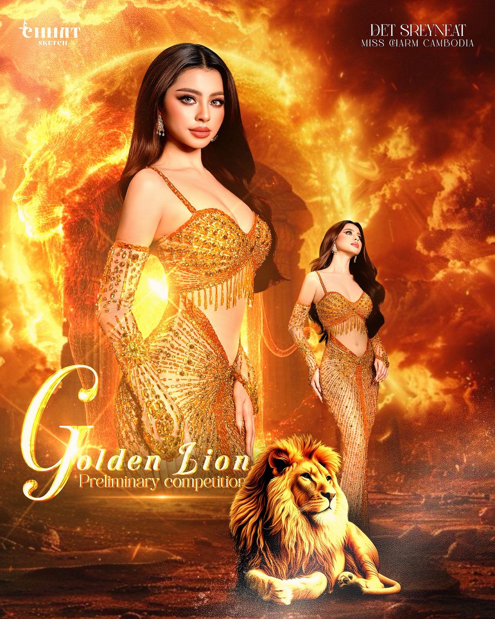 ចំណែក Evening Gown របស់ ស្រីនាឌ វិញ មានឈ្មោះសិង្ហមាស ឬ The Golden Lion យ៉ាងភ្លឺចិញ្ចាច។ ឈុតនេះត្រូវបានបំផុសគំនិតដោយយកលំនាំរចនាបថតួសំពត់របស់អប្សរា មួយនៃប្រាសាទអង្គរវត្ត ដែលមានអាយុកាលរាប់រយឆ្នាំ។ The Golden Lion បានតុបតែង និងឌិនដោយត្បូងពណ៌មាសរាប់ពាន់គ្រាប់ ដែលធ្វើឲ្យបវរកញ្ញាមានភាពស្រស់ស្អាត និងទាក់ទាញ។ ពណ៌មាស បង្ហាញពីជ័យជម្នះ និងសុភមង្គល ខណៈដែលសិង្ហ មានន័យថា ក្លាហាន អង់អាចមោះមុត ។ ជាពិសេសឈុតនេះគឺចង់បង្ហាញពីស្ត្រីម្នាក់ដែលមានភាពថ្លៃថ្នូរ កេរ្តិ៍ឈ្មោះ និងកិត្តិយស ដែលមានភាពអស្ចារ្យ ដូចសិង្ហមាស។