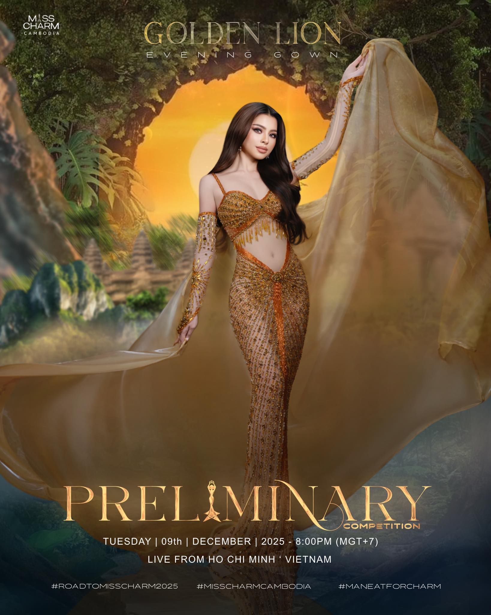 កម្មវិធី Miss Charm 2025 កាលពីរាត្រីថ្ងៃ ៩ ខែធ្នូ បានឈានដល់វគ្គ Preliminary Competition ដោយមានបង្ហាញឈុតតំណាងជាតិ និង Evening Gown។ សម្រាប់ឈុតតំណាងជាតិរបស់ Miss Charm Cambodia 2025 គឺ Angkor Equinox ដែលជាសមរាត្រីរបស់កម្ពុជា ១ ឆ្នាំ មាន ២ដងមានព្រះអាទិត្យរះចំកំពូលប្រាសាទអង្គរវត្តដ៏អស្ចារ្យ។