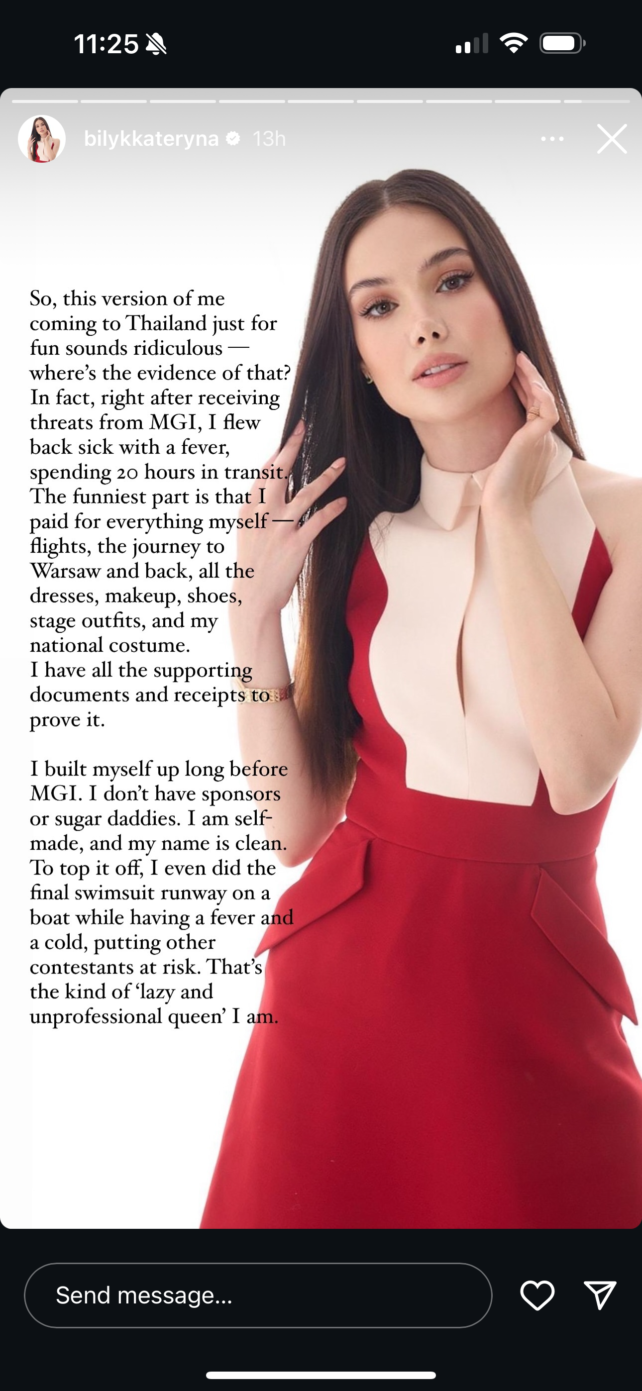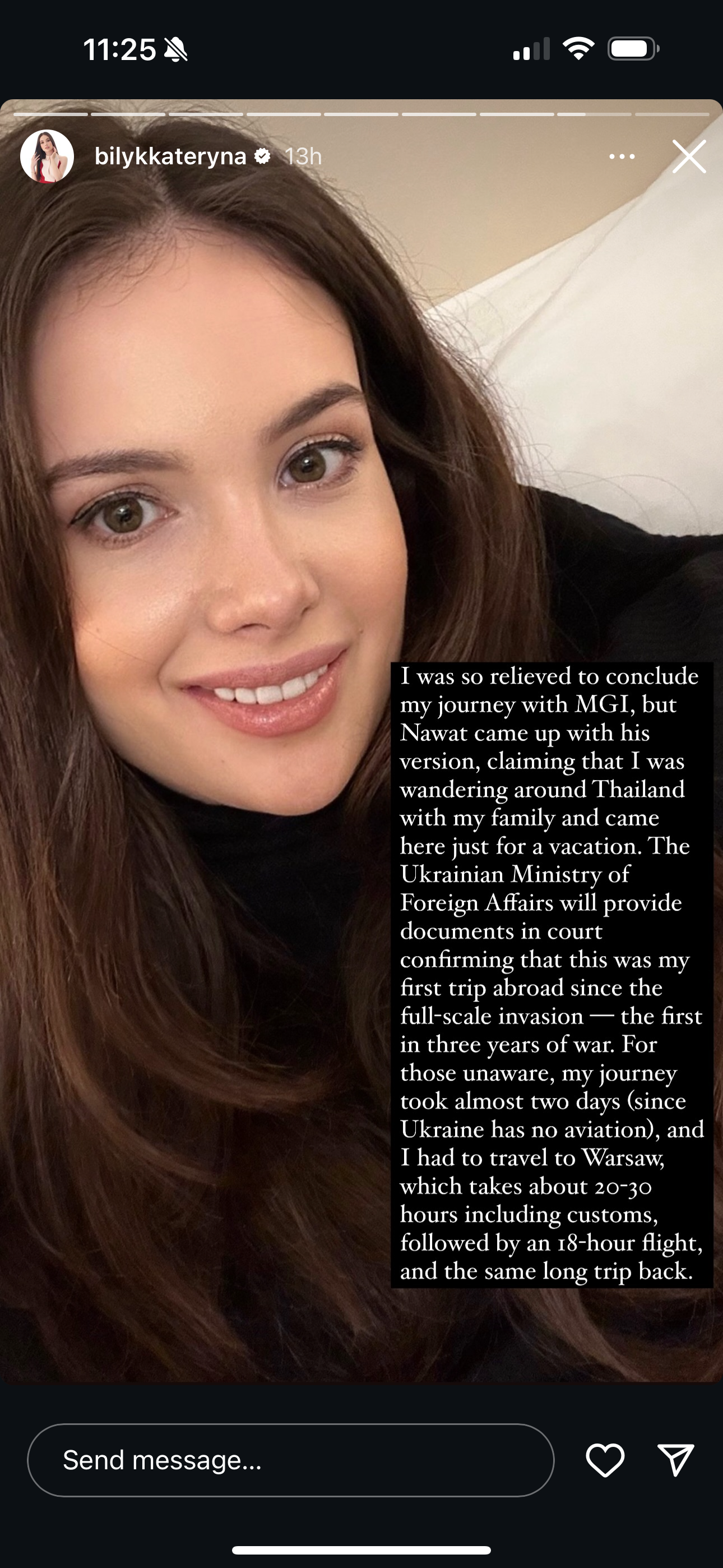 ដោយឡែក Kateryna Bilyk ក៏មិនទុករឿងនេះឱ្យនៅស្ងៀមដែរ ក្រោយពីទៅដល់ប្រទេសកំណើតរបស់ខ្លួនវិញ នាងបានឆ្លើយតបតាមរយៈ Story នៅលើគណនី Instagram ថា គ្មានហេតុផលអ្វីដែលនាងត្រូវធ្វើបែបនេះទេ បើគ្រាន់តែចង់ទៅដើរលេងជាមួយសាច់ញាតិនៅក្នុងប្រទេសថៃនោះ ព្រោះទម្រាំតែទៅដល់ប្រទេសថៃនាងត្រូវធ្វើដំណើរយ៉ាងវេទនា។ នាងបានរៀបរាប់ពីដំណើររបស់ខ្លួនថា ក្រោយសង្គ្រាម នៅក្នុងអ៊ុយគ្រែនគ្មានអាកាសចរណ៍នោះទេ ហេតុនេះហើយនាងត្រូវធ្វើដំណើរ ២០ ទៅ៣០ម៉ោង ទៅកាន់ទីក្រុង Warsaw ប្រទេស Poland និងត្រូវជិះយន្តហោះ ១៨ម៉ោងទៀត។
