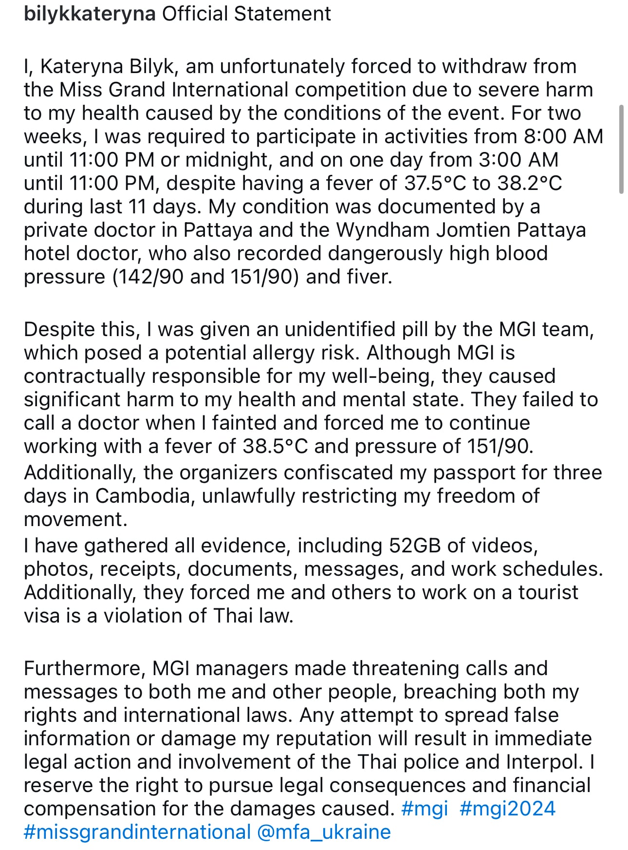 កាលពីថ្ងៃទី១៩ ខែតុលានេះ កញ្ញា Kateryna Bilyk ដែលជា Miss Grand Ukraine បានប្រកាសនៅលើគណនី Instagram ផ្ទាល់ខ្លួនថា នាងបានសម្រេចចិត្តបោះបង់សិទ្ធិប្រកួតក្នុងកម្មវិធី Miss Grand International 2024 ដោយហេតុផលនៃការបំពានសិទ្ធិសេរីភាព និងការបង្ខិតបង្ខំនានារហូតប៉ះពាល់ដល់សុខភាពផ្លូវកាយ និងផ្លូវចិត្តរបស់ខ្លួន។