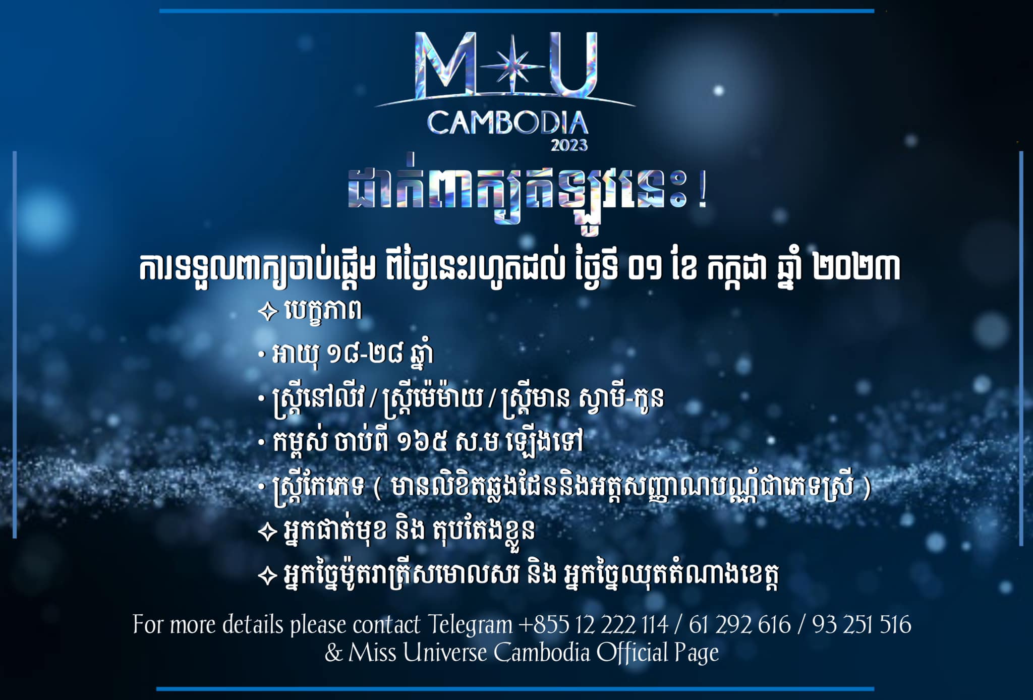 តួយ៉ាង ទំព័រហ្វេសប៊ុក Miss Universe Cambodia គ្រប់គ្រងដោយ ក្រុមហ៊ុន មហាហង្ស ចាប់ផ្តើមបើកទទួលពាក្យ Miss Universe Cambodia 2023 ហើយ កាលពីថ្ងៃទី១ ខែឧសភា ឆ្នាំ ២០២៣ កន្លងទៅ រហូតដល់ថ្ងៃទី ០១ ខែកក្កដា ឆ្នាំ ២០២៣។