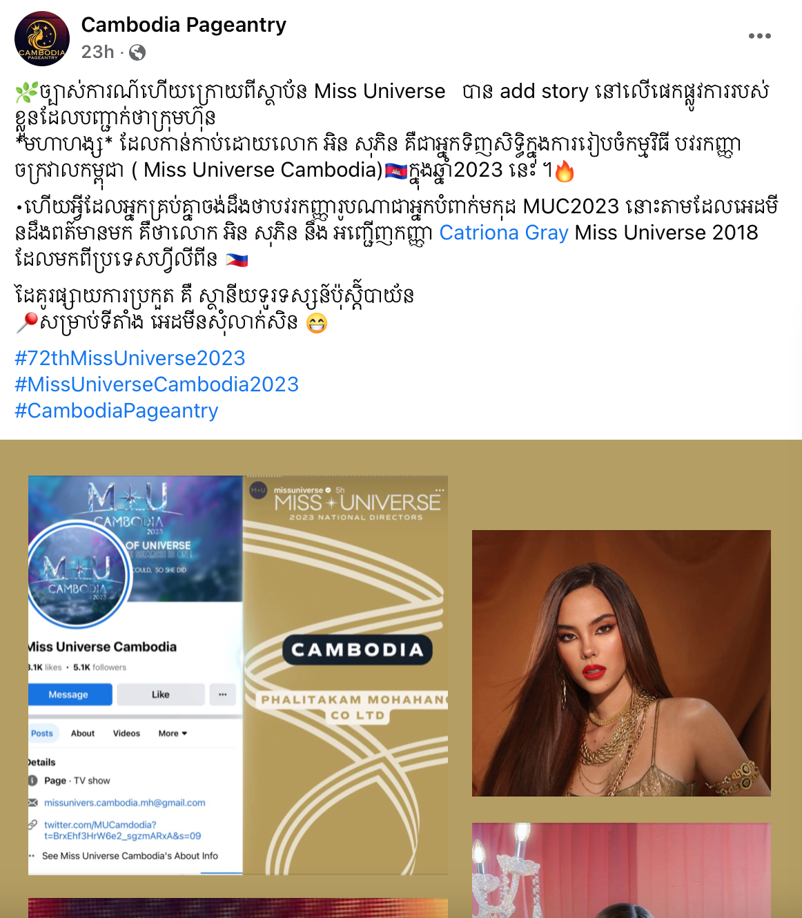 ក្រឡេកមកការបង្ហោះរបស់ទំព័រហ្វេសប៊ុក Cambodia Pageantry បានឱ្យដឹងថា លោក អិន សុភិន នឹងអញ្ជើញកញ្ញា Catriona Gray ជា Miss Universe 2018 មកពីប្រទេសហ្វីលីពីន មកជាអ្នកបំពាក់មកុដ Miss Universe Cambodia 2023 ហើយដៃគូផ្សាយការប្រកួត គឺស្ថានីយទូរទស្សន៍បាយ័ន ប៉ុន្តែទីតាំង ខាងផេកសុំមិនទាន់បញ្ជាក់នោះឡើយ៕