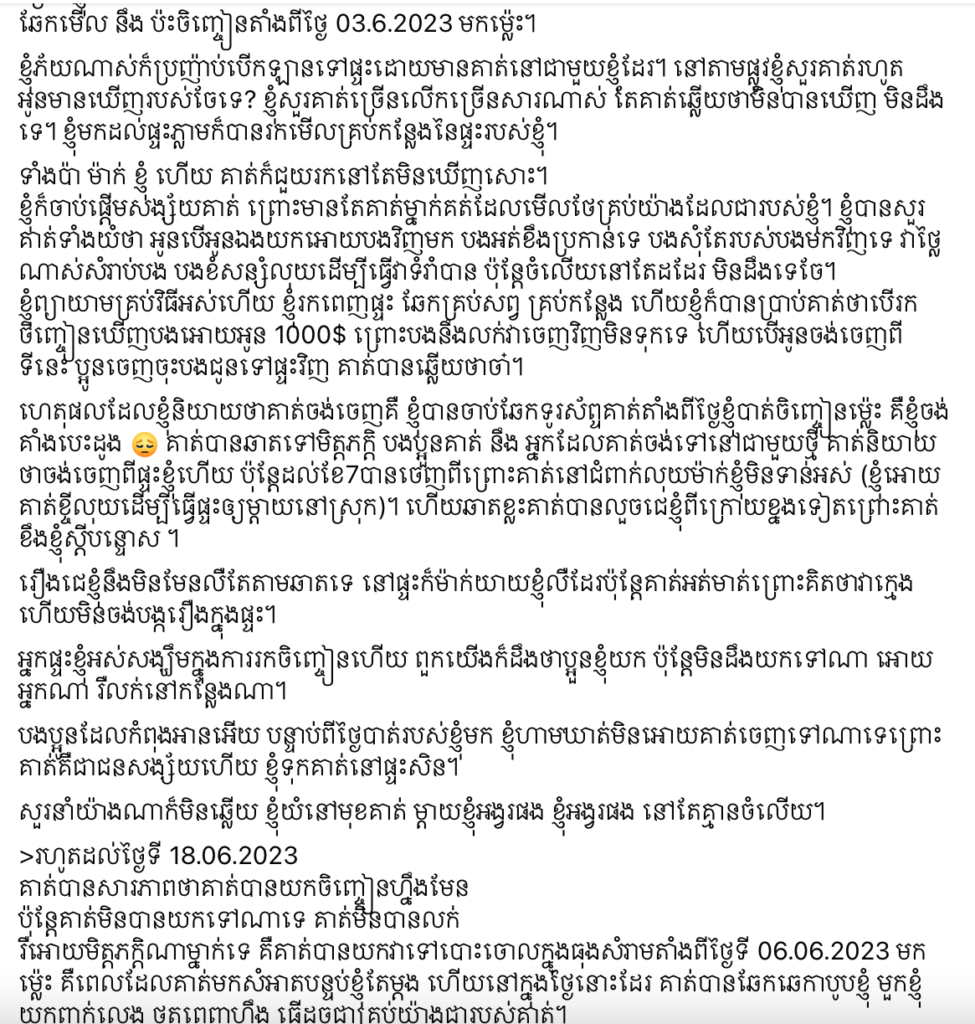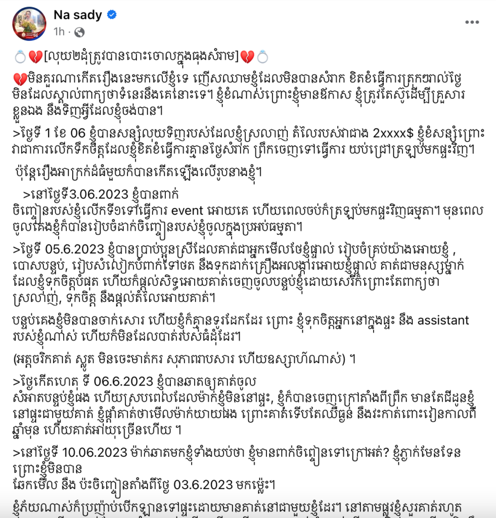 យោងតាមការបង្ហោះរបស់ ណាសាឌី លើទំព័រហ្វេសប៊ុកផ្លូវការរបស់ ណា សាឌី មុននេះបន្តិច បានរៀបរាប់ឱ្យដឹងរឿងហេតុដែលបានកើតឡើងចំពោះនាង ដោយហេតុការណ៍នេះកើតឡើងតាំងពីដើមខែមិថុនាមកម៉្លេះ។ ដើមចមនៃរឿងហេតុនេះកើតឡើងចេញពីចិញ្ចៀនពេជ្រតម្លៃជាង២ម៉ឺនដុល្លារ ដែលកញ្ញាទើបទិញជាកាដូលើកទឹកចិត្តខ្លួនឯង កាលពីថ្ងៃទី១ ខែមិថុនា ឆ្នាំ២០២៣។ ណា សាឌី បានរៀបរាប់ហេតុការណ៍ដែលបានកើតឡើងយ៉ាងលម្អិតយ៉ាងដូចខាងក្រោមនេះ។