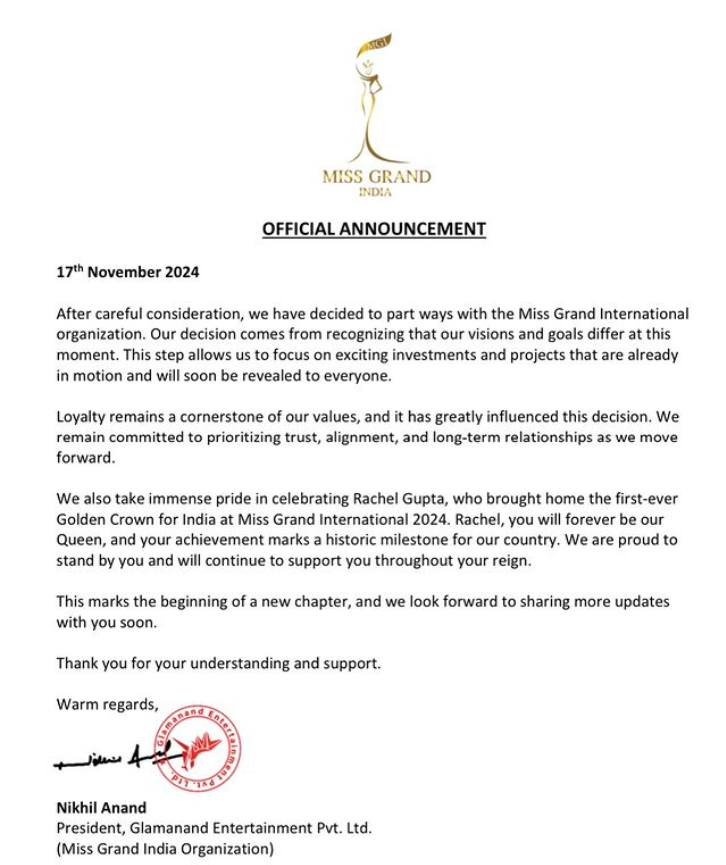បើទោះជាចែកផ្លូវគ្នាជាមួយ Miss Grand International តែ ND នៅតែបង្ហាញការសាទរដល់ Rachel Gupta ដែលបានយកមកុដមាសលើកដំបូង សម្រាប់ប្រទេសឥណ្ឌាក្នុងកម្មវិធី Miss Grand International 2024។ ដោយសេចក្ដីថ្លែងការណ៍នោះបញ្ជាក់ថា Rachel Gupta ជាម្ចាស់ក្សត្រីរហូត ហើយសមិទ្ធផលរបស់នាង គឺជាប្រវត្តិសាស្ត្រសម្រាប់ប្រទេសជាតិ ព្រមទាំងមានមោទនភាពពេលឈរក្បែរនាង ហើយក៏បន្តគាំទ្រ Rachel Gupta ពេញមួយរជ្ជកាលរបស់នាង។