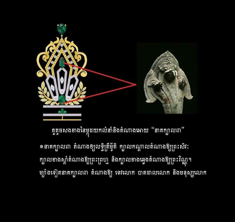 .ហើយតួតូចសងខាងនៃមកុដ យកលំនាំតាម សត្វនាគក្បាល៣ ដែលតំណាងអោយ លទ្ធិត្រីម៌ូតិ