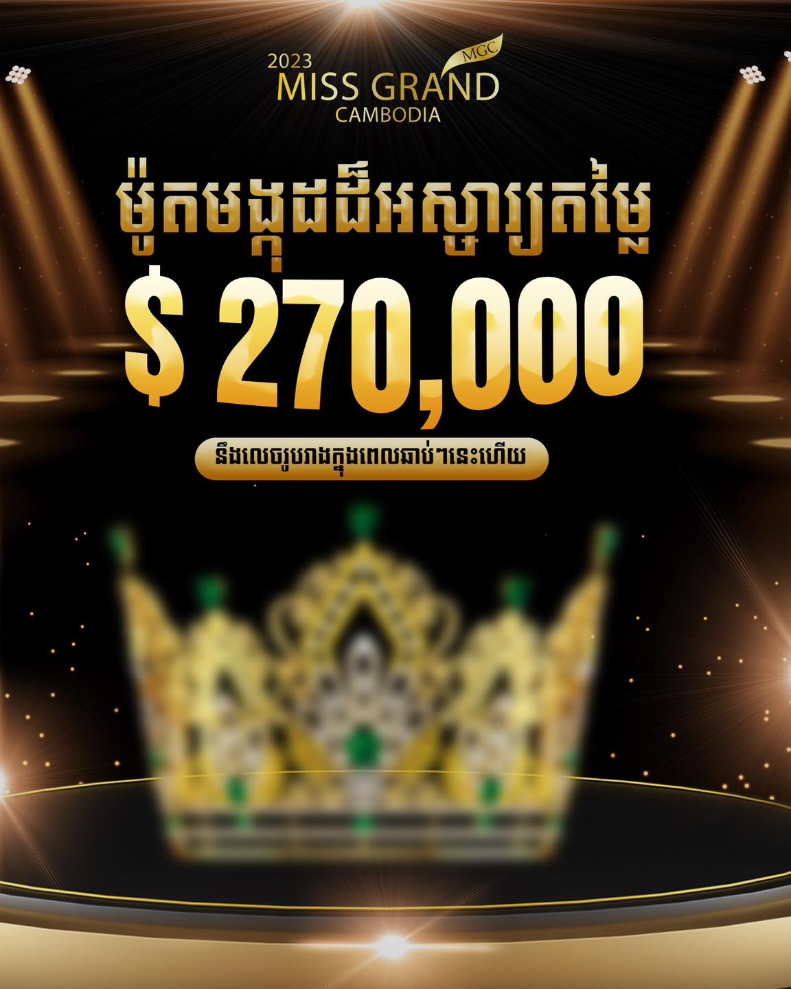មុននេះបន្តិច ទំព័រហ្វេសប៊ុកផ្លូវការ Miss Grand Cambodia បានបង្ហោះឱ្យឃើញមកុដថ្មីសន្លាងរបស់កម្មវិធី Miss Grand Cambodia 2023 ដែលមានតម្លៃដល់ទៅ ២៧ ម៉ឺនដុល្លារ ដោយដាក់ឈ្មោះថា «អាណាចក្រនៃវប្បធម៌» (EMPIRE OF CULTURE) ដោយមកុដនេះ រំលេចនូវភាពច្នៃប្រឌិតផ្អែកលើរចនាបថបុរាណខ្មែរ លាយឡំជាមួយម៉ូដបែបសហសម័យ និងបង្កប់នូវអត្ថន័យយ៉ាងជ្រាលជ្រៅ មើលទៅកាន់តែអស្ចារ្យមិនអាចកាត់ថ្លៃបាន។