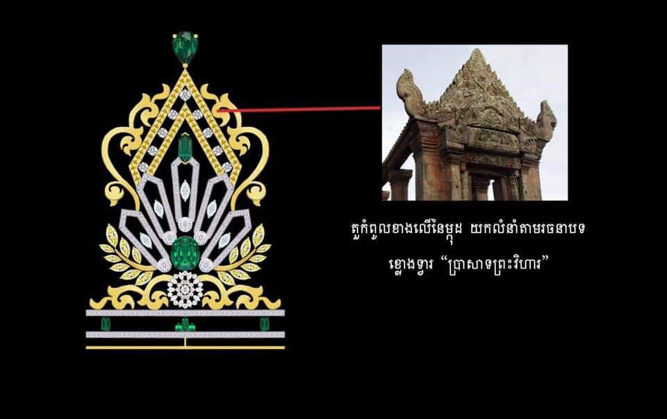 .ក្បាច់ខាងលើនៃតួមកុដ បានយកលំនាំតាម រចនាបថ ខ្លោងទ្វារ នៃប្រាសាទព្រះវិហារ ដែលជាសម្បត្តិ បេតិកភណ្ឌដ៏មហស្ចារ្យរបស់ពិភពលោកមិនអាចកាត់ថ្លៃបាន តួធំកណ្តាលនៃមង្កុដ យកលំនាំតាម សត្វនាគក្បាល៥ តំណាងឱ្យ កំពូលភ្នំមេរុទាំង១០៩ និងតំណាងអោយទិសធំៗទាំង៥ ( ទិសខាងលិច កើត ជើងត្បូង និងទិសកណ្តាល ឬព្រហ្មចារ្យ)