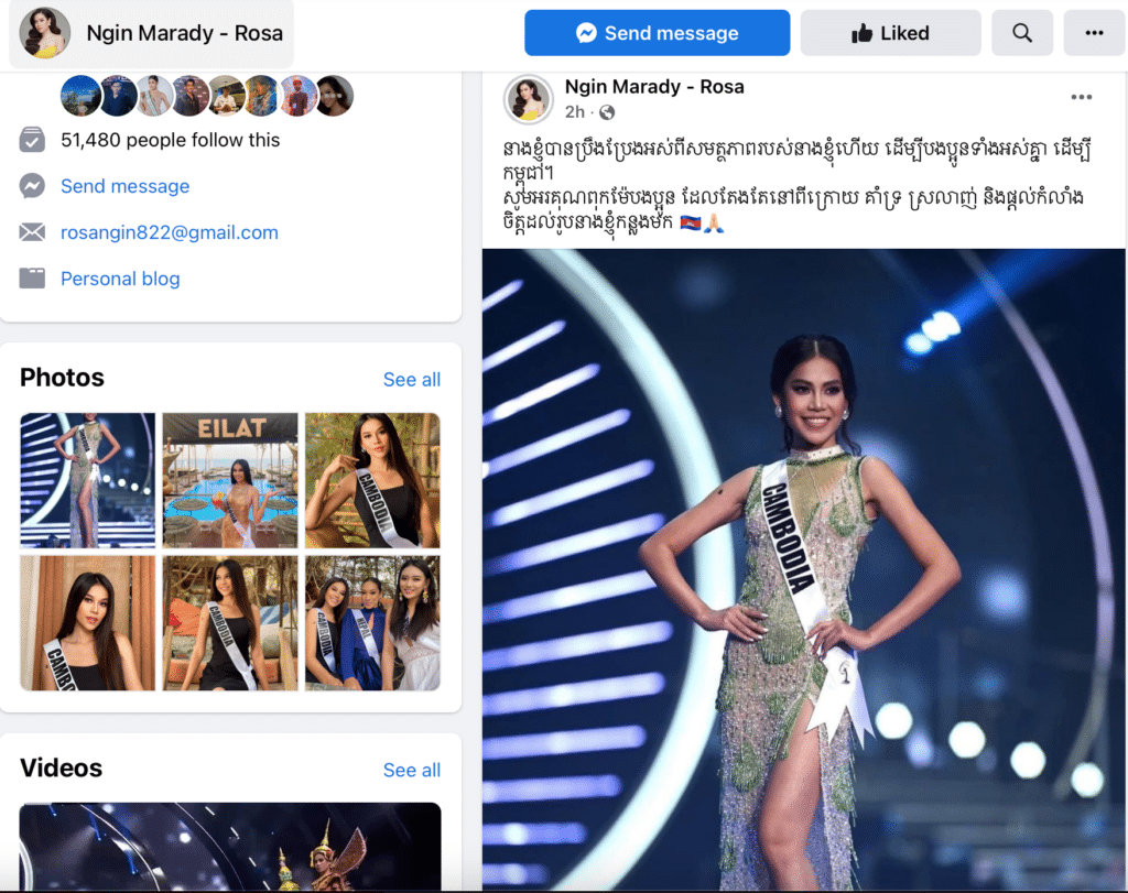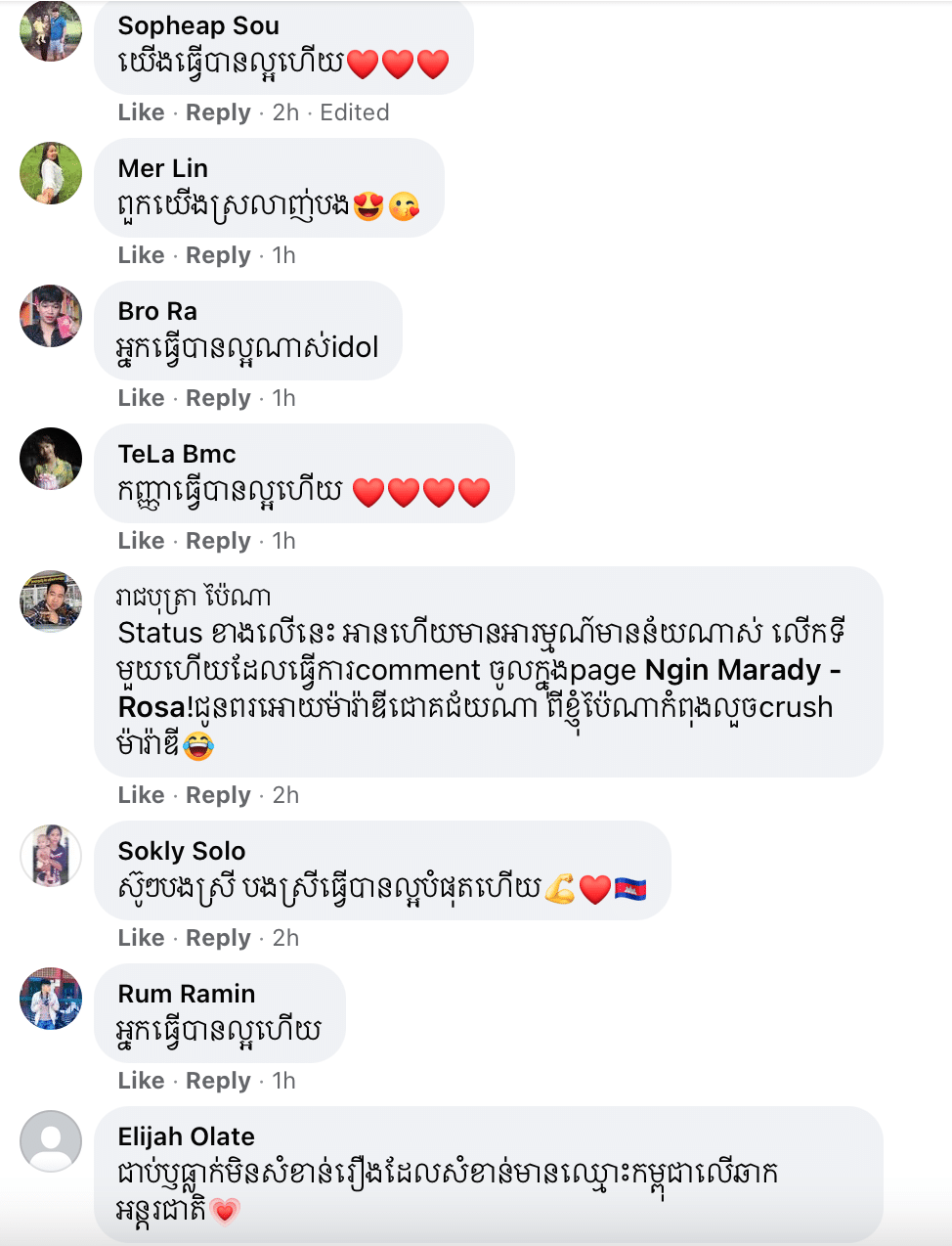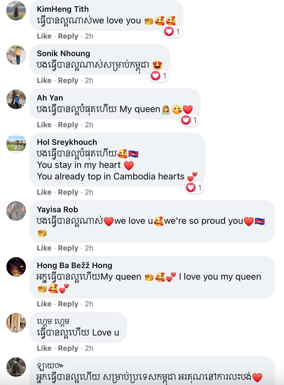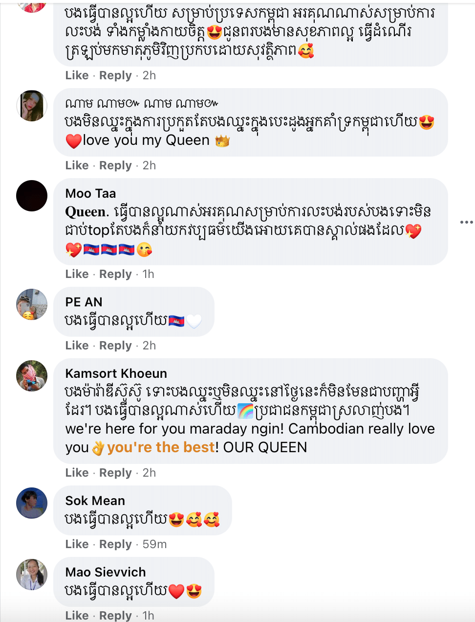 ក្រៅពីនេះ នៅមានសារលើកទឹកចិត្តជាច្រើនដែលប្រជាជនកម្ពុជា បាន Comment ទៅកាន់ កញ្ញា ងិន ម៉ារ៉ាឌី Miss Universe Cambodia 2021។