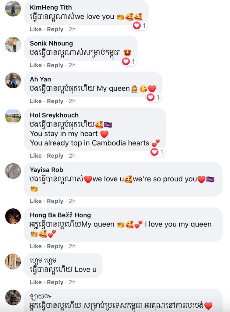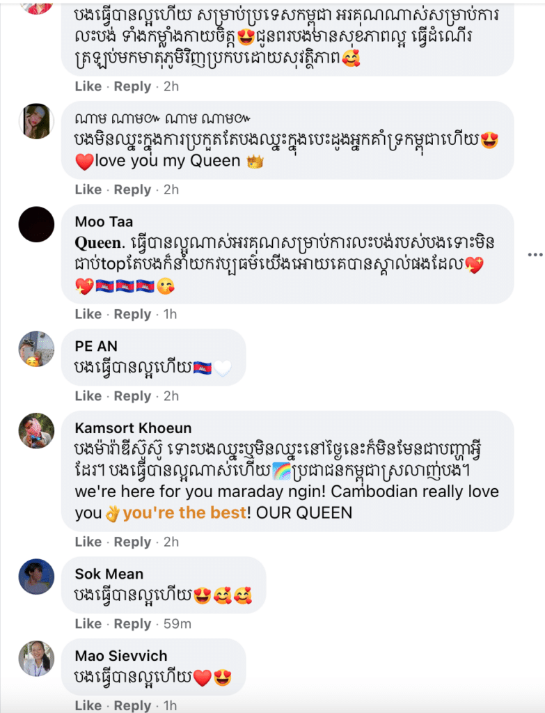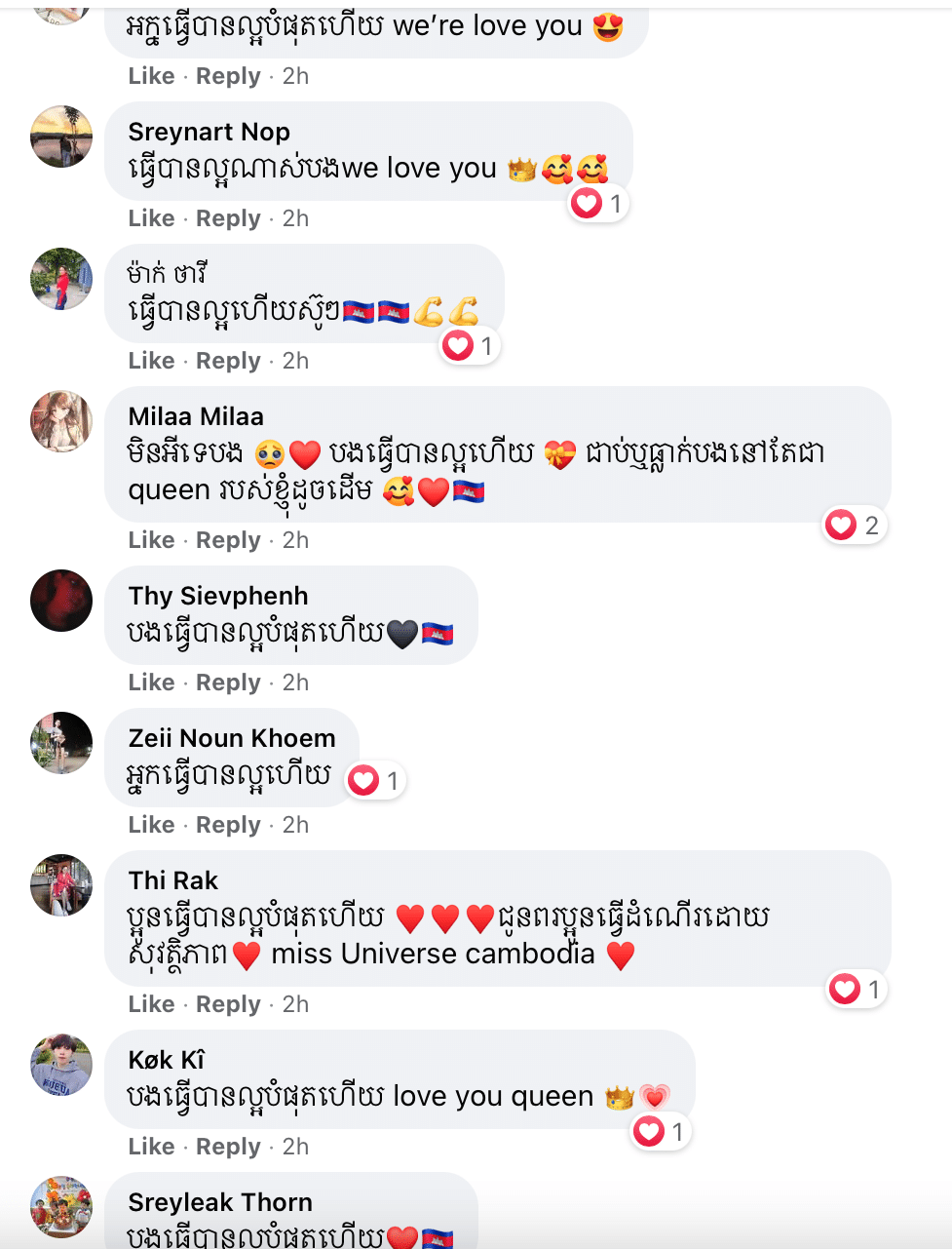 គេសង្កេតឃើញមានអ្នកប្រើប្រាស់ហ្វេសប៊ុកភ្លូកទឹកភ្លូកដីបាននាំគ្នា Comment ពាក្យពេជន៍លើកទឹកចិត្តល្អៗ និងខ្លះទៀត Comment ផ្តល់កម្លាំងចិត្តដល់កញ្ញា។ តួយ៉ាង មានដូចជា៖«បងធ្វើបានល្អហើយ ទោះមិនជាប់Top នៅទីនោះតែបងបានជាប់ Top ក្នុងបេះដូងប្រជាជនខ្មែរ ដែលគេគោរស្រលាញ់និងចងចាំថាបងជាបវរកញ្ញាខ្មែរដ៏អស្ចារ្យម្នាក់សម្រាប់ពួកយើង សូមអគុណដល់ការខិតខំប្រឹងប្រែងរបស់បងចំពោះ ប្រទេសជាតិយើង ពួកយើងនៅទីនេះ ព្រមគ្នានៅក្បែរ និងលើកទឹកចិត្តដល់បងជានិច្ច»«អរគុណបងដែលបានប្រឹងប្រែងដើម្បីប្រទេសរបស់យើង ពួកយើងពិតជាមានមោទនភាពណាស់ដែលបានបងជាអ្នកណែនាំវប្បធម៌ខ្មែរទៅកាន់ពិភពលោកអោយបានស្គាល់»«𝐐𝐮𝐞𝐞𝐧. ធ្វើបានល្អណាស់អរគុណសម្រាប់ការលះបង់របស់បងទោះមិនជាប់topតែបងក៏នាំយកវប្បធម៌យើងអោយគេបានស្គាល់ផងដែល»«No Problems Sister. ពួកយើងនៅរងចាំបង ត្រឡប់មកវេទិកា បវរកញ្ញា ក្រោយៗទៀត Cambodia We did it»។