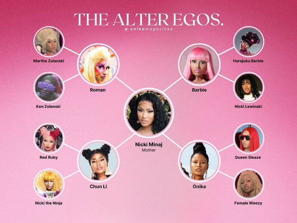 ចំណុចពិសេសមួយទៀតដែលនាំឱ្យ Nicki Minaj លេចធ្លោលើសតារារ៉េបដទៃ គឺតារាស្រីរូបនេះមានវិធីសាស្ត្រក្នុងការនិទានសាច់រឿងតាមបទភ្លេងយ៉ាងគួរឱ្យចាប់អារម្មណ៍ តាមរយៈតួអង្គដែលនាងបង្កើតឡើង ឬ Alter Ego ដែលមានច្រើនជម្រើស មិនថា Roman Zolanski, Harajuku Barbie, Chun Li និង Onika នោះទេ។