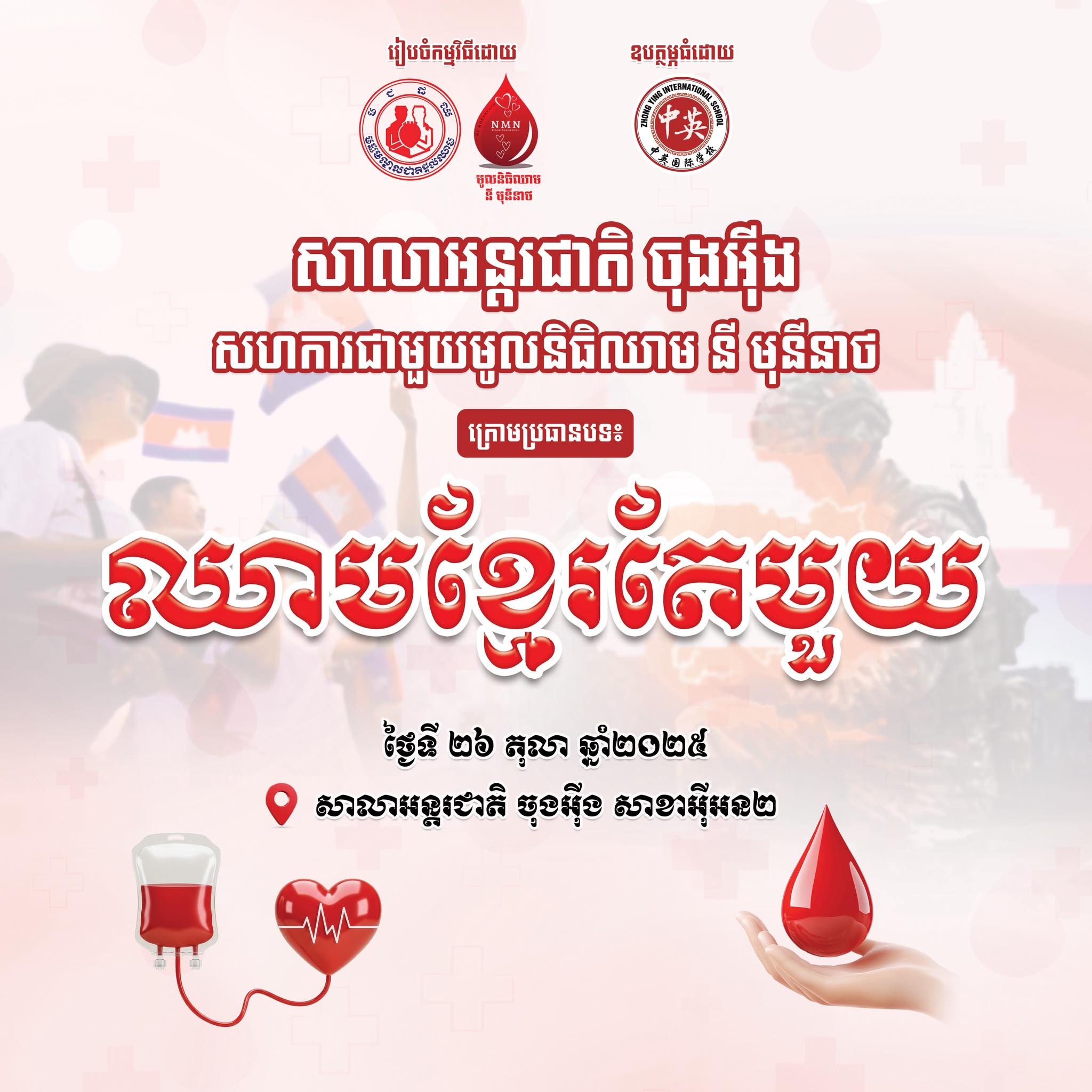 សម្រាប់ការចូលរួមបរិច្ចាគឈាមគឺពុំមានអស់ប្រាក់ ឬថ្លៃសេវាអ្វីនោះទេ។ ក្នុងថ្ងៃនោះក៏មានការប្រទានឱវាទពីសំណាក់ព្រះមុនីចរិយាវង្ស ហ៊ុន ខេមរា ទៅកាន់បណ្ដាអ្នកចូលរួមផងដែរ។ គួរបញ្ជាក់ថា ព្រឹត្តិការណ៍បរិច្ចាគឈាមខ្មែរតែ១ នឹងធ្វើឡើងនៅថ្ងៃអាទិត្យ ទី ២៦ ខែ តុលា ឆ្នាំ ២០២៥ ចាប់ពីម៉ោង ៨ ព្រឹក រហូតដល់ម៉ោង ៤ រសៀល នៅទីតាំងសាលាចុងអ៊ីង សាខាអ៊ីអន២៕