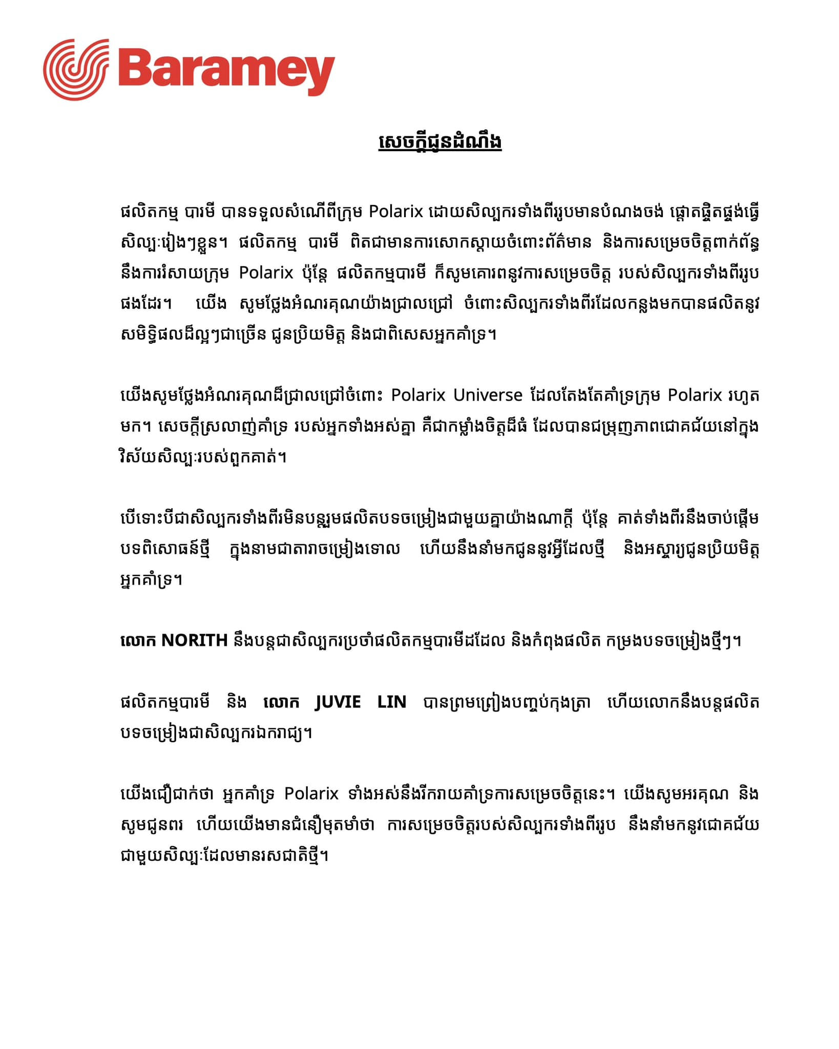 ដូចប្រិយមិត្តបានជ្រាបស្រាប់ហើយថា កាលពីថ្ងៃទី១០ ខែឧសភា កន្លងទៅ ទំព័រហ្វេសប៊ុកផ្លូវការ Baramey Production បានចេញសេចក្តីជូនដំណឹងពីការរំសាយក្រុម Polarix ដែលក្នុងនោះ នរិទ្ធ នៅបន្តជាសិល្បករប្រចាំផលិតកម្ម បារមី ខណៈដែល ជូវី បានព្រមព្រៀងបញ្ចប់កុងត្រាជាសិល្បករប្រចាំផលិតកម្ម ហើយបន្តផលិតបទចម្រៀងក្នុងនាមជាសិល្បករឯករាជ្យវិញម្តង។