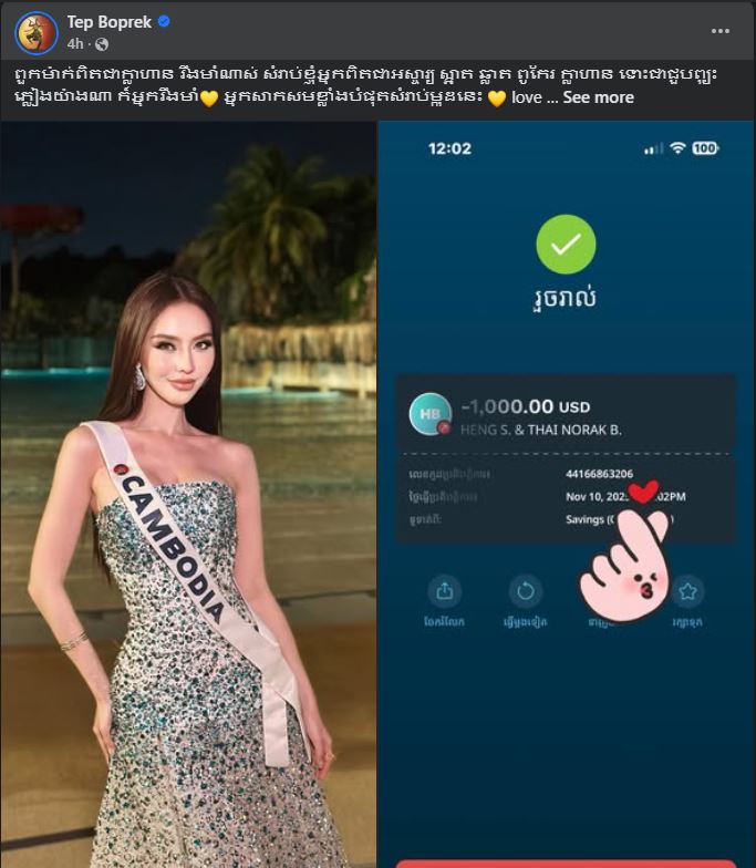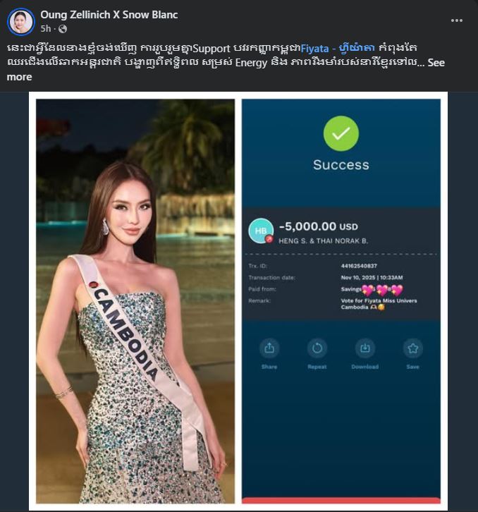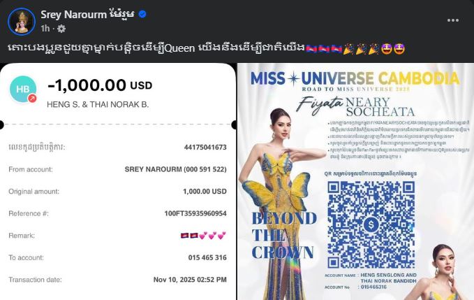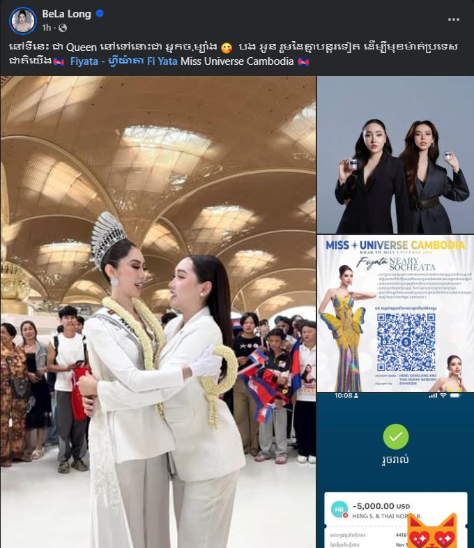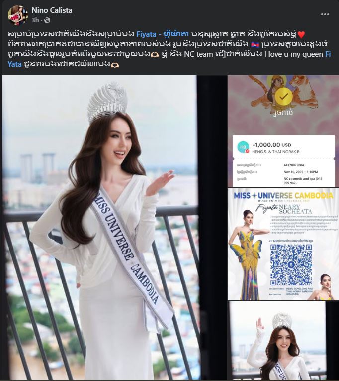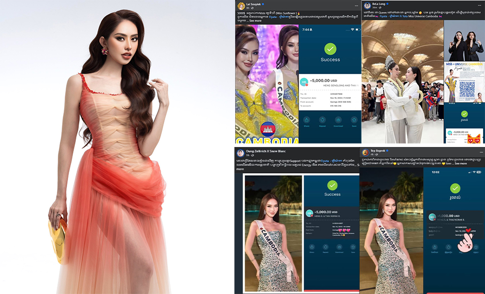 បណ្ដាអ្នករកស៊ីក្នុងវិស័យអនឡាញជាច្រើននាក់បានប្រើថវិកាផ្ទាល់ខ្លួនបោះឆ្នោតឱ្យបវរកញ្ញាកម្ពុជា ហ្វីយ៉ាតា ដើម្បីបានចូលក្នុង top ជ្រៅណាមួយនៅក្នុងកម្មវិធីប្រកួតលំដាប់ពិភពលោក Miss Universe 2025 សរុបជាទឹកប្រាក់ប្រមាណជិត ២ ម៉ឺនដុល្លារ។