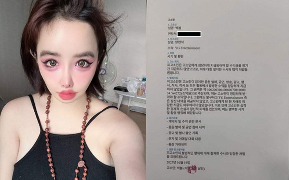 គួរបញ្ជាក់ថា កាលពីយប់ថ្ងៃទី ២២ ខែតុលា Park Bom បានបង្ហោះរូបភាពនៃពាក្យបណ្ដឹងដែលមានស្លាកសរសេរថា៖ “បណ្ដឹង Park Bom ចោទប្រកាន់ Yang Hyun Suk” នៅលើគណនី Instagram ផ្ទាល់ខ្លួនរបស់នាង រួមជាមួយ Caption សរសេរថា៖ “Park Bom ស្អប់ YG។ អ្នកលេងអ៊ិនធឺណិតជាទីស្រឡាញ់ទាំងអស់គ្នា សូមពិនិត្យមើលឱ្យបានហ្មត់ចត់នូវអ្វីដែល YG បានធ្វើចំពោះ Park Bom សូមអរគុណ។”