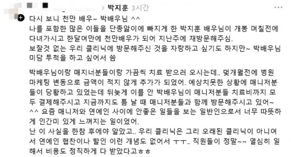 តាមរយៈការបង្ហោះកាលពីថ្ងៃទី ១៧ ខែមីនា លោកគ្រូពេទ្យម្នាក់បានរៀបរាប់ថាកាលពីប៉ុន្មានខែមុន នៅពេលថ្លៃព្យាបាលនៅគ្លីនិកមានការកើនឡើងខ្ពស់លើសពីការរំពឹងទុក ធ្វើឱ្យអ្នកចាត់ការទូទៅរបស់ Park Ji Hoon មានការបារម្ភ សម្រាប់ថ្លៃចំណាយព្យាបាល។ លោកគ្រូពេទ្យរូបនេះបានបន្ដថា នៅពេលដែលតារាប្រុសវ័យ ២៧ ឆ្នាំបានដឹងអំពីរឿងនេះហើយ លោកបានសម្រេចចិត្តចេញមុខមកទទួលរ៉ាប់រងរាល់ការចំណាយទាំងអស់របស់អ្នកចាត់ការផ្ទាល់ខ្លួនលោកដោយផ្ទាល់តែម្តង។