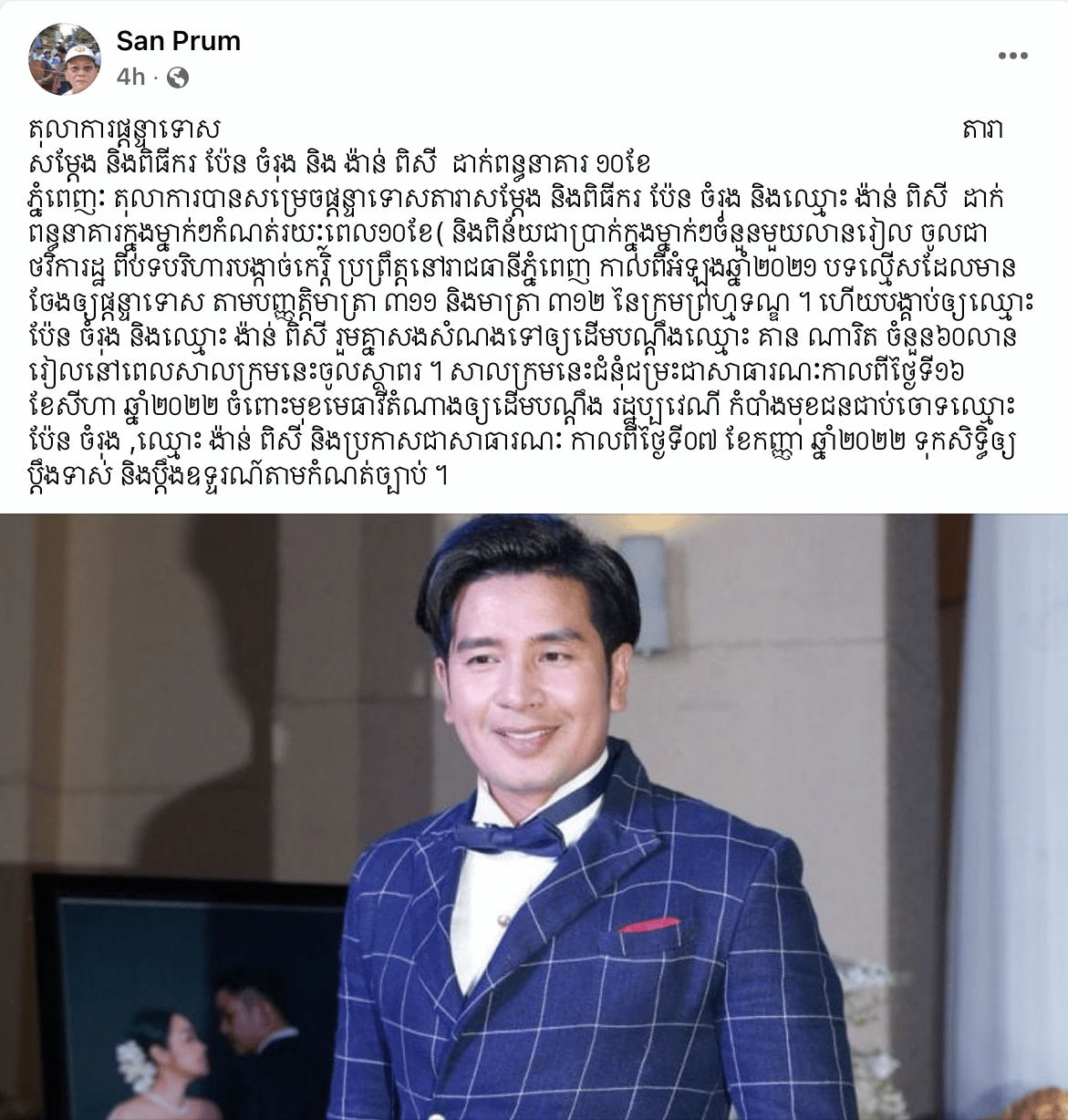 ព្រឹកនេះមានរឿងភ្ញាក់ផ្អើលមួយបានកើតឡើងលើ ពិធីករ និងជាតារាសម្តែង លោក ប៉ែន ចំរុង បន្ទាប់ពីទំព័រហ្វេសប៊ុកឈ្មោះ San Prum បានបង្ហោះថា«តុលាការផ្តន្ទាទោស តារាសម្តែង និងពិធីករ ប៉ែន ចំរុង និង ង៉ាន់ ពិសី ដាក់ពន្ធនាគារ ១០ខែ ភ្នំពេញៈ តុលាការបានសម្រេចផ្តន្ទាទោសតារាសម្តែង និងពិធីករ ប៉ែន ចំរុង និងឈ្មោះ ង៉ាន់ ពិសី ដាក់ពន្ធនាគារក្នុងម្នាក់ៗកំណត់រយៈពេល១០ខែ( និងពិន័យជាប្រាក់ក្នុងម្នាក់ៗចំនួនមួយលានរៀល ចូលជាថវិការដ្ឋ ពីបទបរិហារបង្កាច់កេរ្តិ៍ ប្រព្រឹត្តនៅរាជធានីភ្នំពេញ កាលពីអំឡុងឆ្នាំ២០២១ បទល្មើសដែលមានចែងឲ្យផ្តន្ទាទោស តាមបញ្ញត្តិមាត្រា ៣១១ និងមាត្រា ៣១២ នៃក្រមព្រហ្មទណ្ឌ ។ ហើយបង្គាប់ឲ្យឈ្មោះ ប៉ែន ចំរុង និងឈ្មោះ ង៉ាន់ ពិសី រួមគ្នាសងសំណងទៅឲ្យដើមបណ្តឹងឈ្មោះ គាន ណារិត ចំនួន៦០លានរៀលនៅពេលសាលក្រមនេះចូលស្ថាពរ ។ សាលក្រមនេះជំនុំជម្រះជាសាធារណៈកាលពីថ្ងៃទី១៦ ខែសីហា ឆ្នាំ២០២២ ចំពោះមុខមេធាវីតំណាងឲ្យដើមបណ្តឹង រដ្ឋប្បវេណី កំបាំងមុខជនជាប់ចោទឈ្មោះ ប៉ែន ចំរុង ,ឈ្មោះ ង៉ាន់ ពិសី និងប្រកាសជាសាធារណៈ កាលពីថ្ងៃទី០៧ ខែកញ្ញា ឆ្នាំ២០២២ ទុកសិទ្ធិឲ្យប្តឹងទាស់ និងប្តឹងឧទ្ទរណ៍តាមកំណត់ច្បាប់ »
