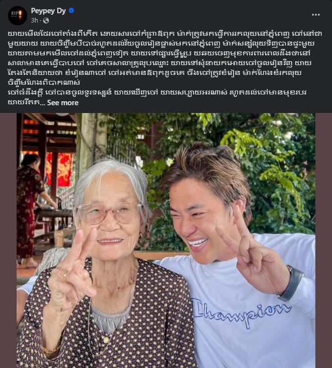 កាលពីប៉ុន្មានម៉ោងមុននេះ ពិធីការិនី ហេង កែវនីតា និង Pey Pey Dy បានបាត់បង់លោកយាយជាទីស្រលាញ់ ដោយបន្សល់ទុកត្រឹមអនុស្សាវរីយ៍ ការចងចាំល្អៗអ្នកទាំងពីរ និងលោកយាយតែប៉ុណ្ណោះ។