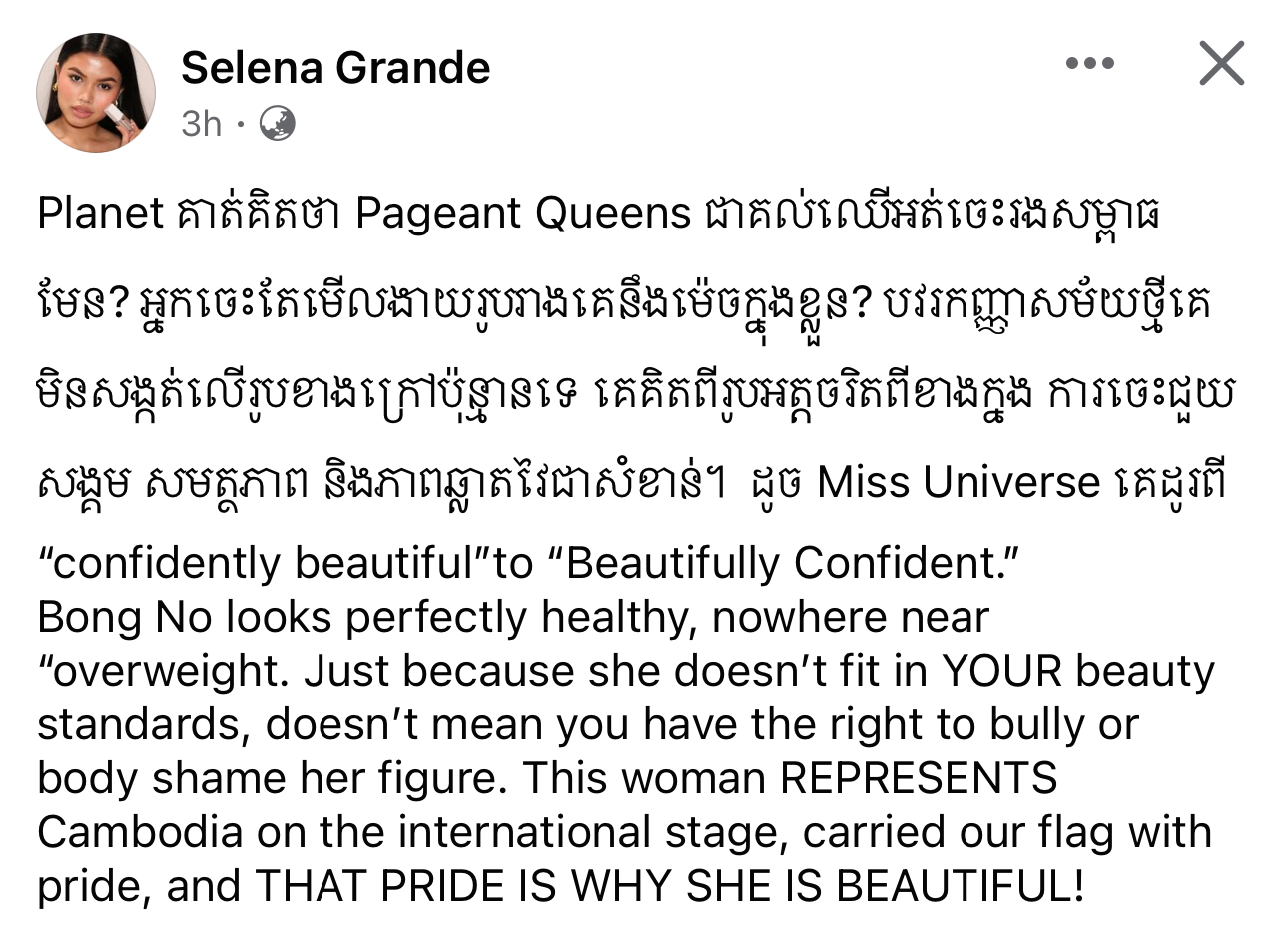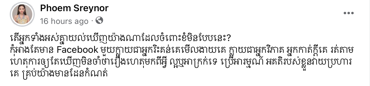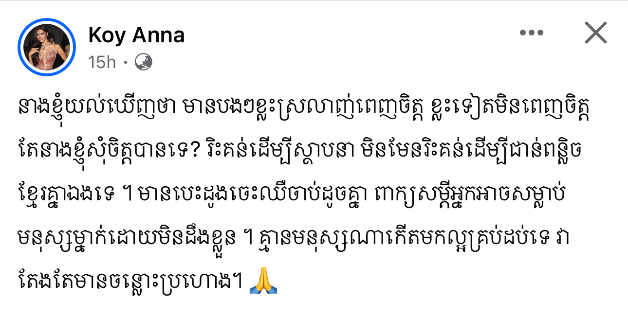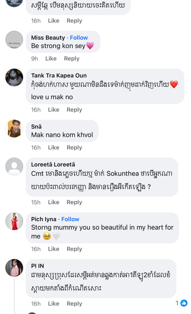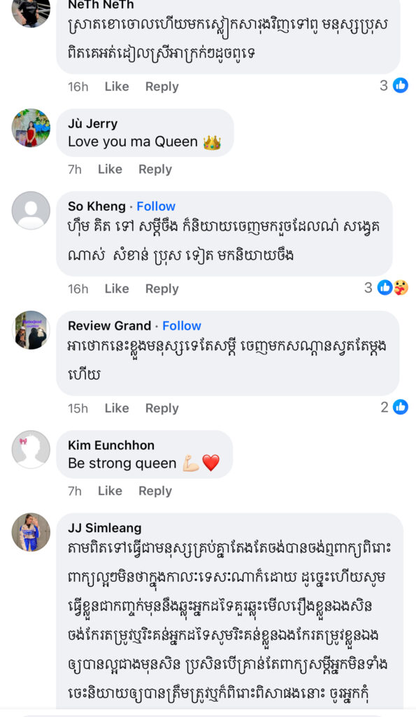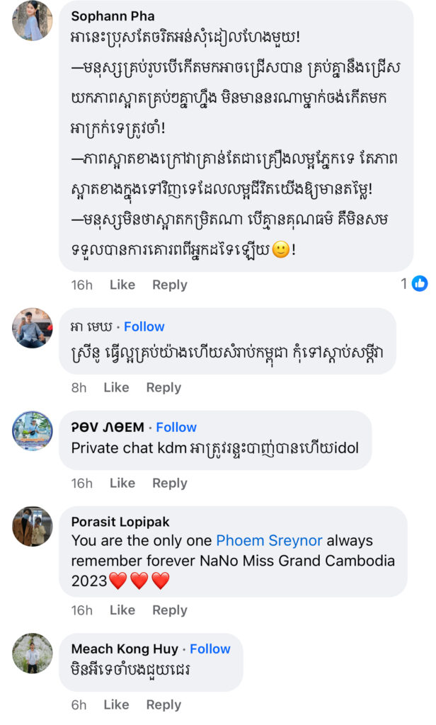 ម្ចាស់មកុដ Miss Grand Cambodia 2023 រៀបរាប់ថា «តើអ្នកទាំងអស់គ្នាយល់ឃើញយ៉ាងណាដែលចំពោះខំមិនបែបនេះ? កុំអាងតែមាន Facebook មួយក្លាយជាអ្នករិះគន់គេមើលងាយគេ ក្លាយជាអ្នកវិភាគ អ្នកកាត់ក្ដីគេ រត់តាមហេតុការឲ្យតែឃើញមិនចាំថារឿងហេតុមកពីអ្វី ល្អឬអាក្រក់ទេ ប្រើអារម្មណ៍ អគតិរបស់ខ្លួនវាយប្រហារគេ គ្រប់យ៉ាងមានដែនកំណត់»។ ថែមទាំងបញ្ជាក់ថា លើកនេះនាងសុំការពារសិទ្ធិខ្លួនឯងម្ដង។