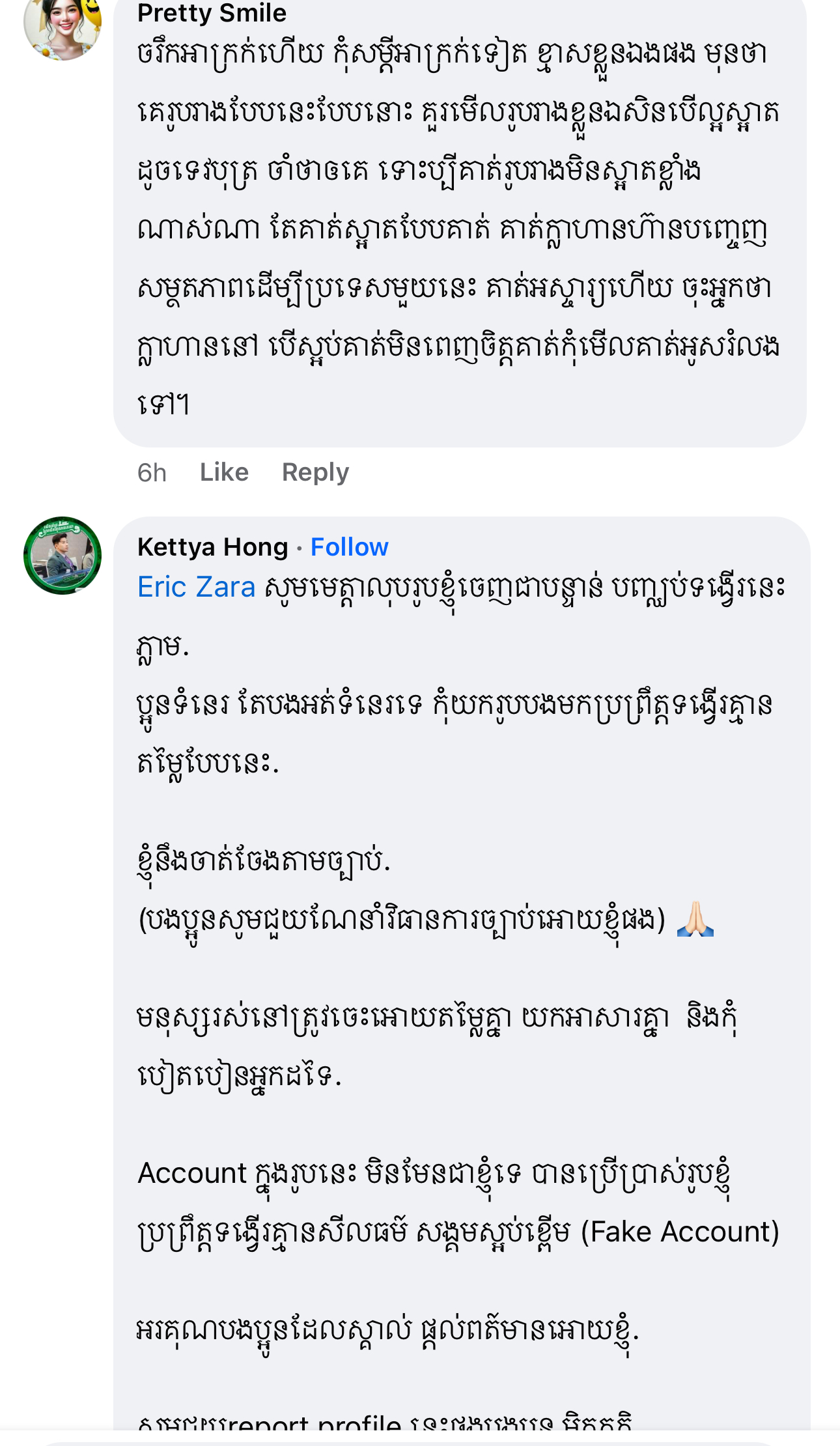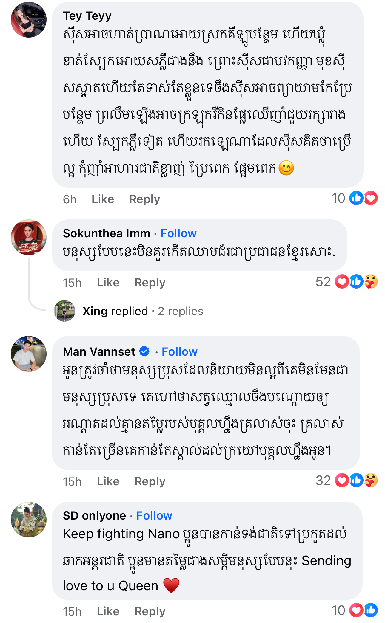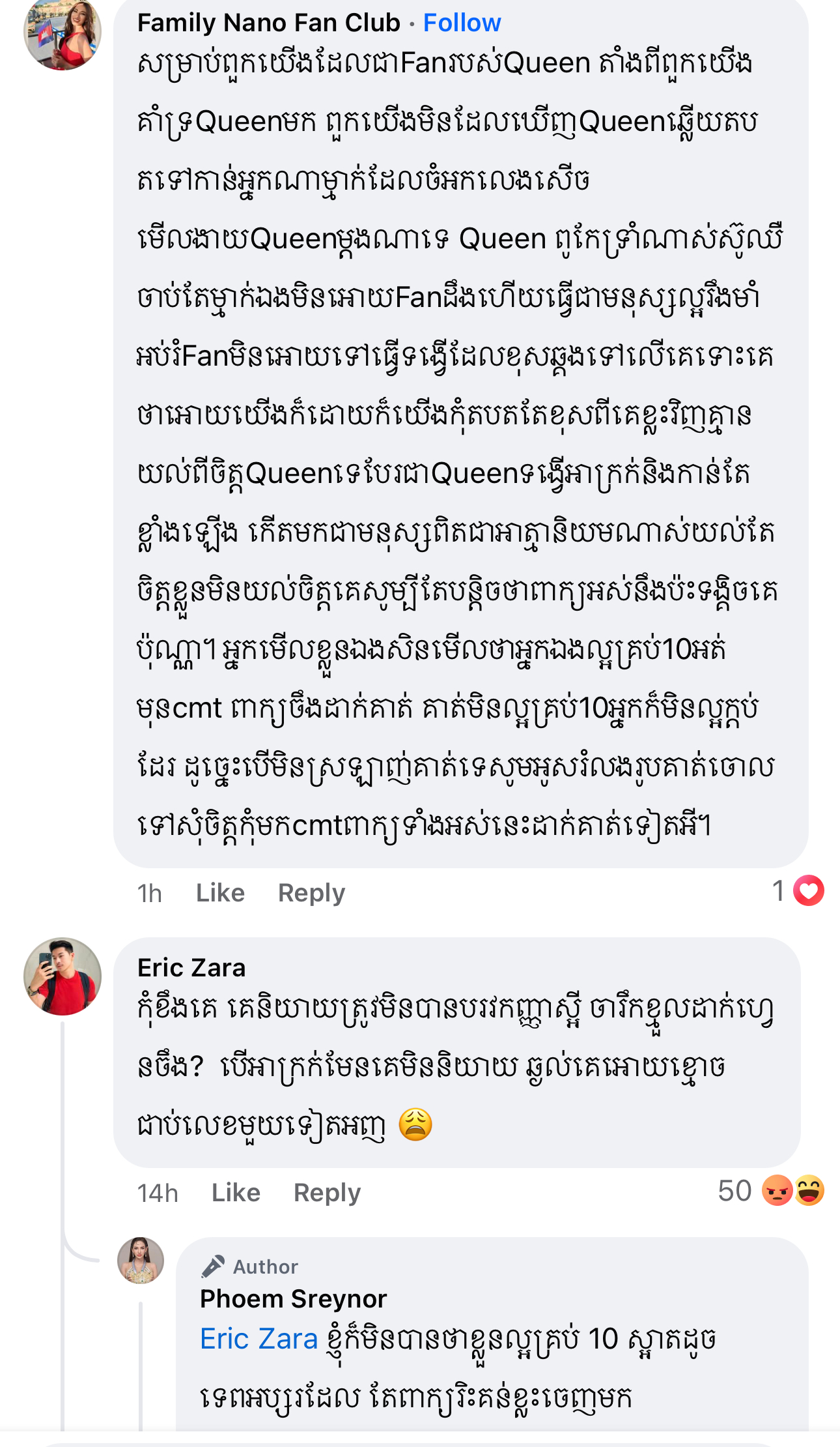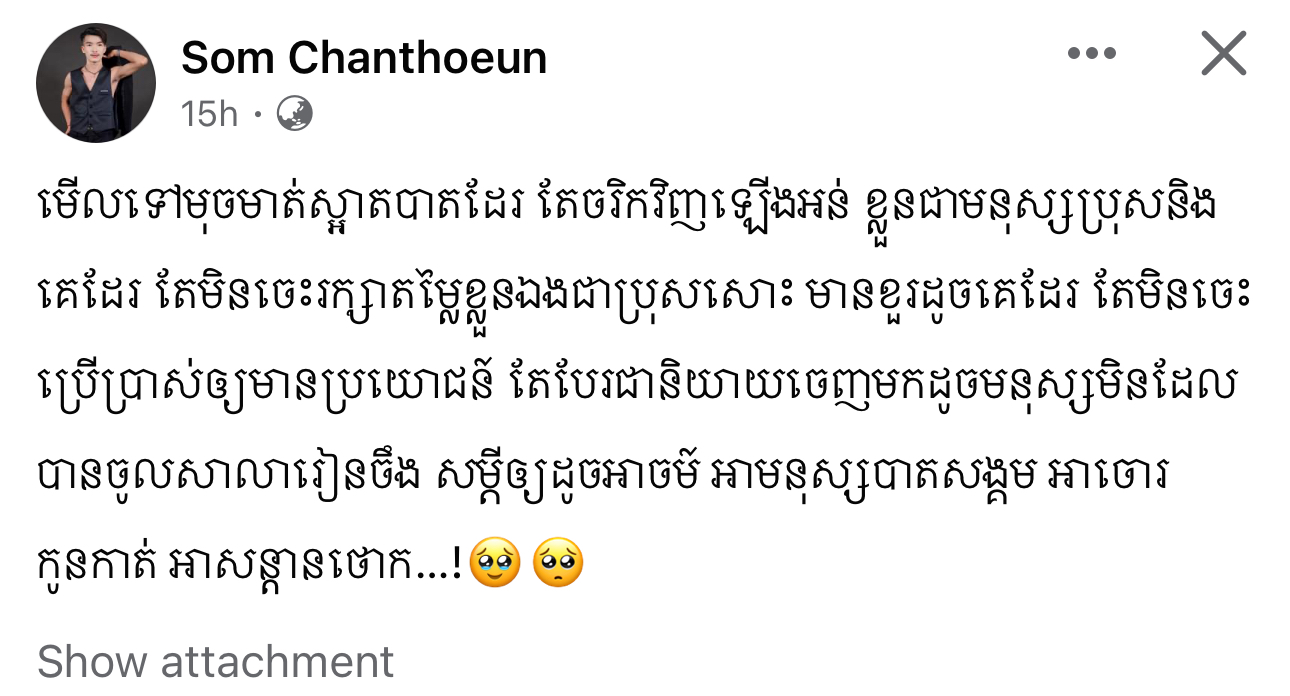 ម្ចាស់មកុដ Miss Grand Cambodia 2023 រៀបរាប់ថា «តើអ្នកទាំងអស់គ្នាយល់ឃើញយ៉ាងណាដែលចំពោះខំមិនបែបនេះ? កុំអាងតែមាន Facebook មួយក្លាយជាអ្នករិះគន់គេមើលងាយគេ ក្លាយជាអ្នកវិភាគ អ្នកកាត់ក្ដីគេ រត់តាមហេតុការឲ្យតែឃើញមិនចាំថារឿងហេតុមកពីអ្វី ល្អឬអាក្រក់ទេ ប្រើអារម្មណ៍ អគតិរបស់ខ្លួនវាយប្រហារគេ គ្រប់យ៉ាងមានដែនកំណត់»។ ថែមទាំងបញ្ជាក់ថា លើកនេះនាងសុំការពារសិទ្ធិខ្លួនឯងម្ដង។