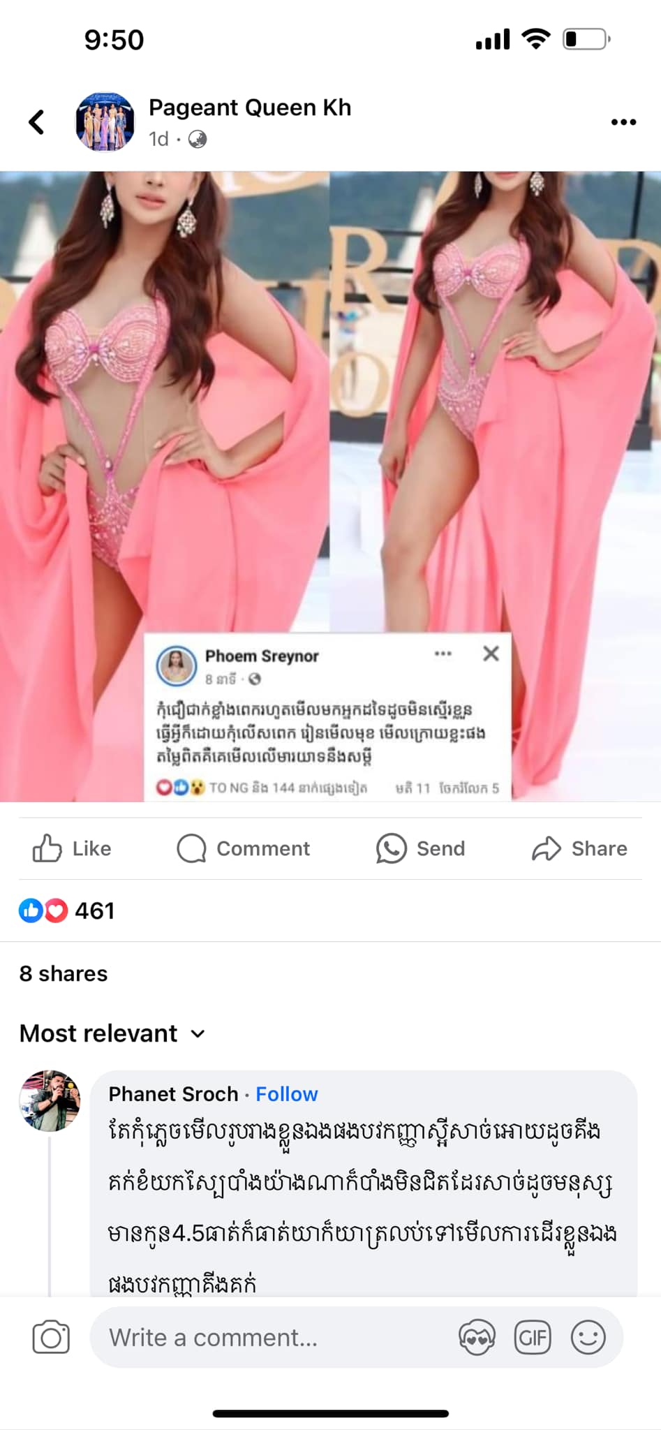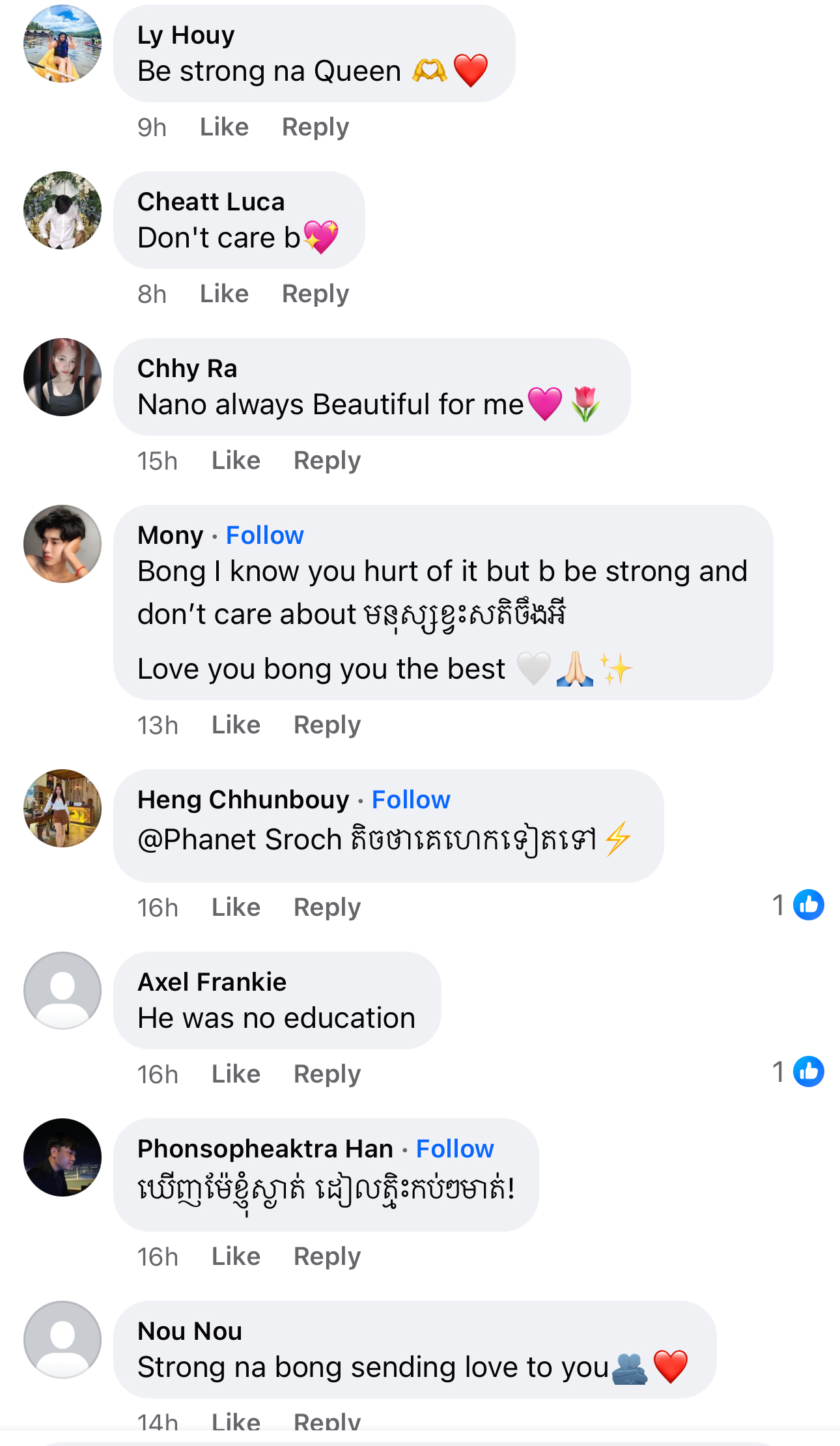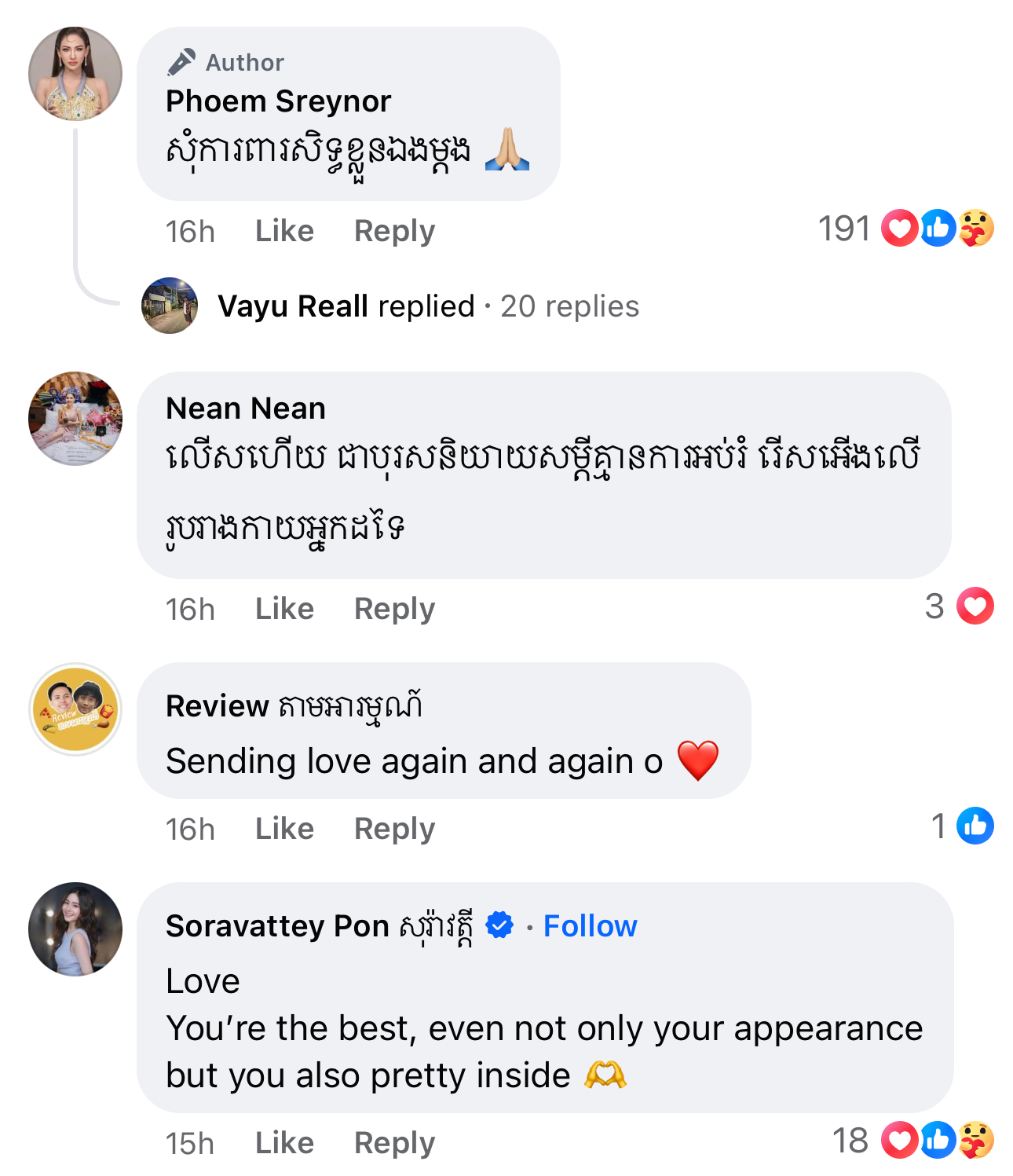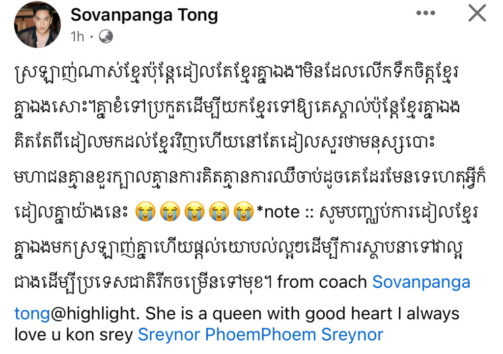 ម្ចាស់មកុដ Miss Grand Cambodia 2023 រៀបរាប់ថា «តើអ្នកទាំងអស់គ្នាយល់ឃើញយ៉ាងណាដែលចំពោះខំមិនបែបនេះ? កុំអាងតែមាន Facebook មួយក្លាយជាអ្នករិះគន់គេមើលងាយគេ ក្លាយជាអ្នកវិភាគ អ្នកកាត់ក្ដីគេ រត់តាមហេតុការឲ្យតែឃើញមិនចាំថារឿងហេតុមកពីអ្វី ល្អឬអាក្រក់ទេ ប្រើអារម្មណ៍ អគតិរបស់ខ្លួនវាយប្រហារគេ គ្រប់យ៉ាងមានដែនកំណត់»។ ថែមទាំងបញ្ជាក់ថា លើកនេះនាងសុំការពារសិទ្ធិខ្លួនឯងម្ដង។