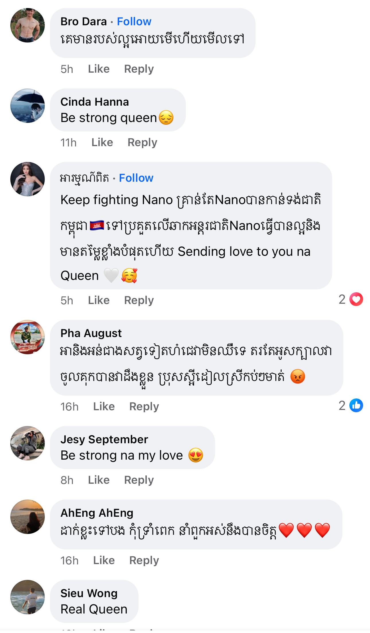 បន្ទាប់ពីឃើញការបង្ហោះរបស់ ណាណូ រួចមក បណ្តាអ្នកគាំទ្រ និងបវរកញ្ញារួមអាជីពយ៉ាងច្រើនកុះករ បាននាំគ្នាចេញមុខការពារ គាំទ្រចំពោះការក្រោកឈរឡើងការពារខ្លួនរបស់ម្ចាស់មកុដរូបនេះ ថែមទាំងបានបង្ហាញការយល់ឃើញផ្សេងៗគ្នាទៀតផង។ ទន្ទឹមគ្នានោះ ក៏នៅមានមតិរិះគន់មួយចំនួនបន្តកើតឡើង ស្របគ្នាមតិរិះគន់ក្នុងន័យស្ថាបនាដើម្បីឱ្យ ស្រីនោ បង្កើនភាពស្រស់ស្អាត និងភាពជឿជាក់លើខ្លួនឯងផងដែរ៕