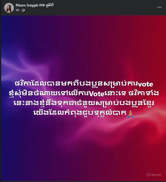 ដំណឹងផ្លូវការនៃការបាញ់ប្រហាររបស់ទ័ពសៀមមកលើដែនអធិបតេយ្យភាពកម្ពុជា នាវេលាព្រឹកថ្ងៃទី ៨ ខែ ធ្នូ ឆ្នាំ ២០២៥ បានធ្វើបវរកញ្ញាតំណាងប្រទេស ផន ស្រីពី សម្រេចចិត្តភ្លាមៗ ក្នុងការបង្វែរទឹកប្រាក់នៃការ Vote ធ្វើរឿងដើម្បីជាតិនិងប្រជាជនកម្ពុជាវិញ។ ស្រីពី បានបង្ហោះលើអាខោនផ្លូវការយ៉ាងដូច្នេះថា៖ «ថវិកាដែលបានមកពីបងប្អូនសម្រាប់ការ vote ខ្ញុំសុំមិនចំណាយទៅលើការVoteនោះទេ ថវិកាទាំងនេះនាងខ្ញុំនឹងទុកជាជំនួយសម្រាប់បងប្អូនខ្មែរយើងដែលកំពុងជួបទុក្ខលំបាក»។