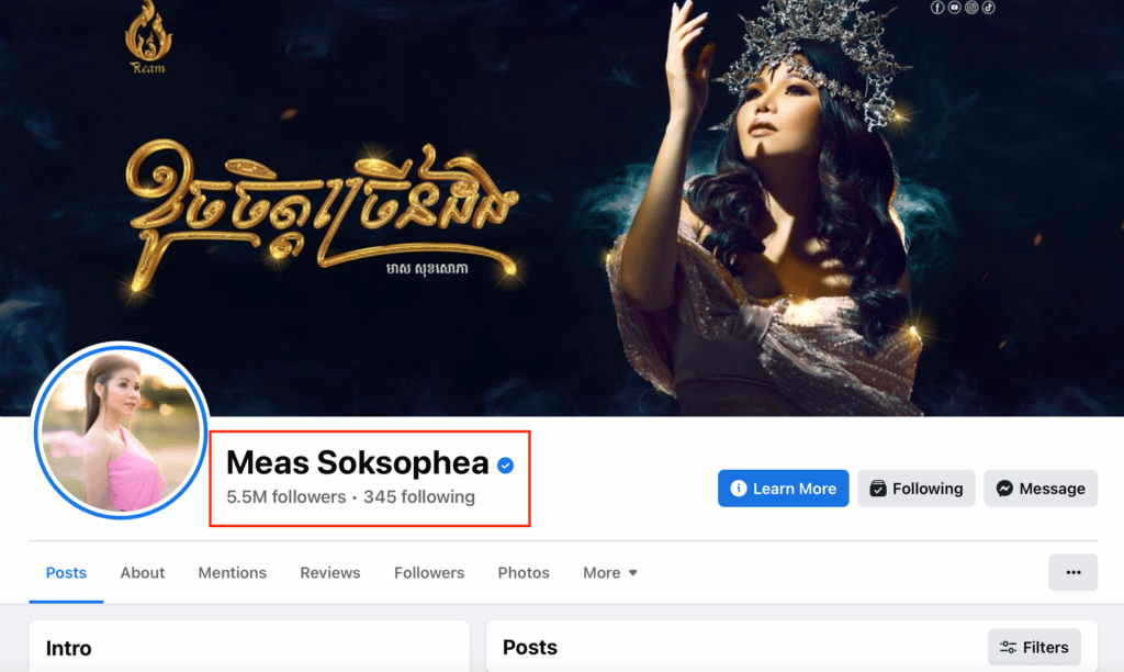គិតត្រឹមម៉ោង១២ថ្ងៃត្រង់ ថ្ងៃទី៥ ខែកញ្ញា ឆ្នាំ២០២២ សិល្បករខ្មែរដែលមានចំនួន Follower លំដាប់ទី១ គឺ តារាចម្រៀងសំឡេងស្រទន់ មាស សុខសោភា មាន follower 5.5M, លំដាប់ទី២ បានទៅលើតារាចម្រៀង ពេជ្រ សោភា មាន Follower 4M, លំដាប់ទី៣ បានលើកំពូលតារាចម្រៀង ឱក សុគន្ធកញ្ញា មាន follower 3.7M, លំដាប់ទី៤ តារាចម្រៀងជួរមុខក្នុងផលិតកម្ម Galaxy Navatra កញ្ញា តន់ ចន្ទសីម៉ា មាន follower 2.8M , លំដាប់ទី៥ បានលើតារាចម្រៀង ងួន ចាន់ដេវីត ហៅ G-Devith មាន follower 2.5M៕