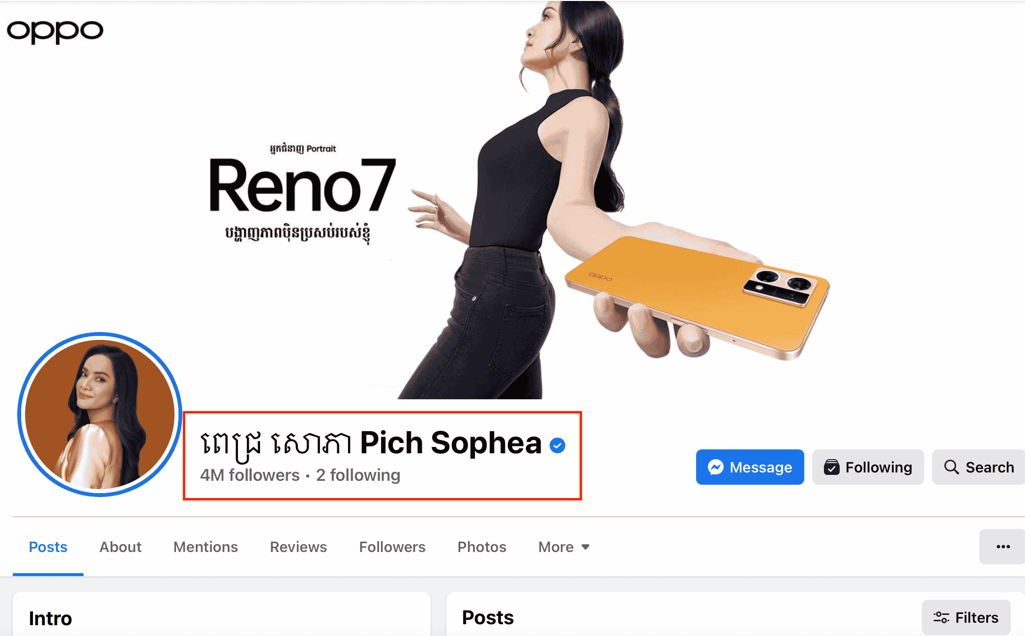 ក្រឡេកមកមើលទំព័រហ្វេសប៊ុកតារាចម្រៀងស្រី ពេជ្រ សោភា ឯណោះវិញ ថ្មីៗនេះ ទើបទទួលបាន Follower 4M ស្មើនឹងបួនលាននាក់ ក្លាយជាសិល្បករខ្មែរលំដាប់ទី២ បន្ទាប់ពីតារាចម្រៀងសំឡេងផ្អែម មាស សុខសោភា ដែលមាន follower 5.5M ឈរនៅលំដាប់ទី១ និងជាអ្នកមាន Follower ច្រើនជាងគេលើបណ្តាញសង្គមនៅកម្ពុជា ចំណែកវ៉ាកំពូលតារាចម្រៀង ឱក សុគន្ធកញ្ញា វិញមាន follower 3.7M។