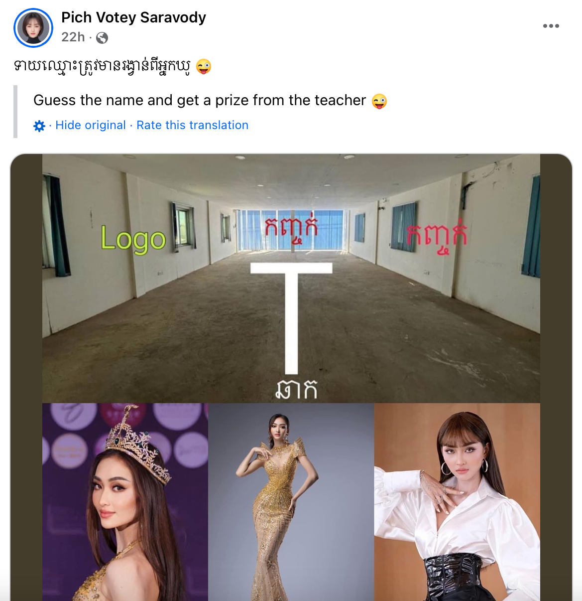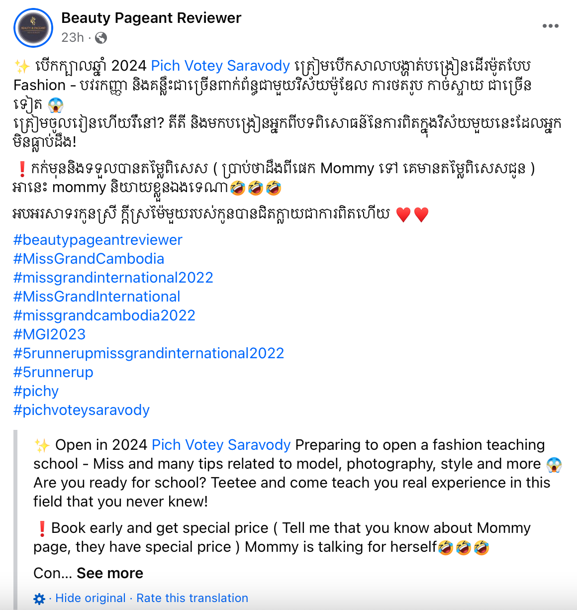 ទន្ទឹមការបង្ហោះខាងលើ គណនីហ្វេសប៊ុកផ្លូវការ Pich Votey Saravody ក៏បានចែករំលែកភ្ជាប់ជាមួយពាក្យមួយឃ្លាថា «ទាយឈ្មោះត្រូវមានរង្វាន់ពីអ្នកឃូ» បញ្ជាក់ថា នាងពិតជាត្រៀមបើកសាលាបង្ហាត់បង្រៀនដើរម៉ូដ និងគន្លឹះផ្សេងៗប្រាកដមែន។