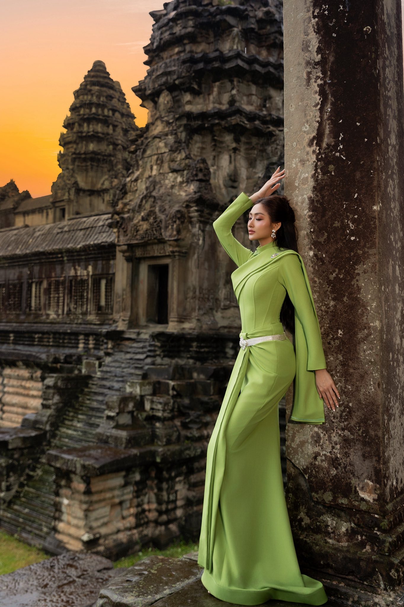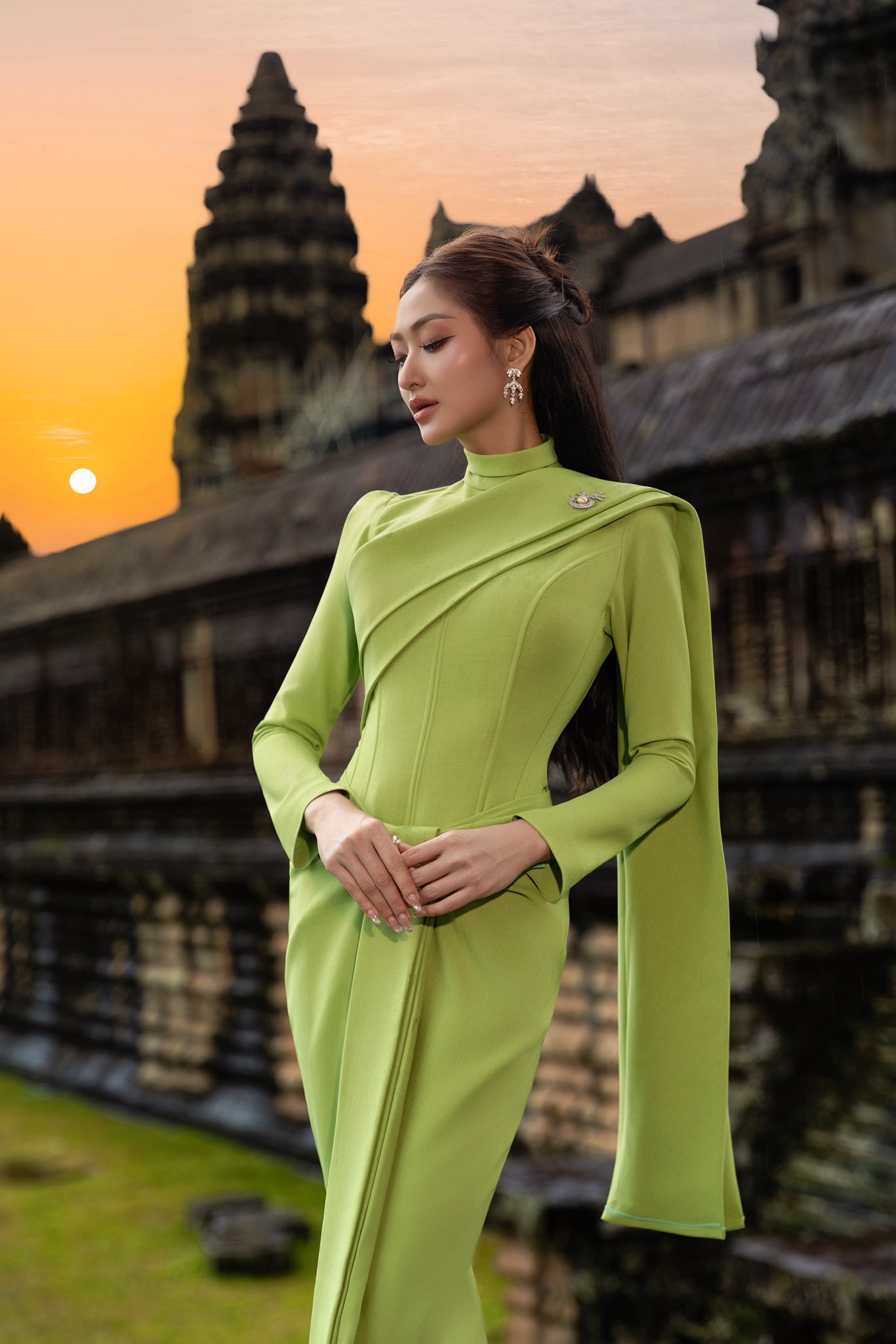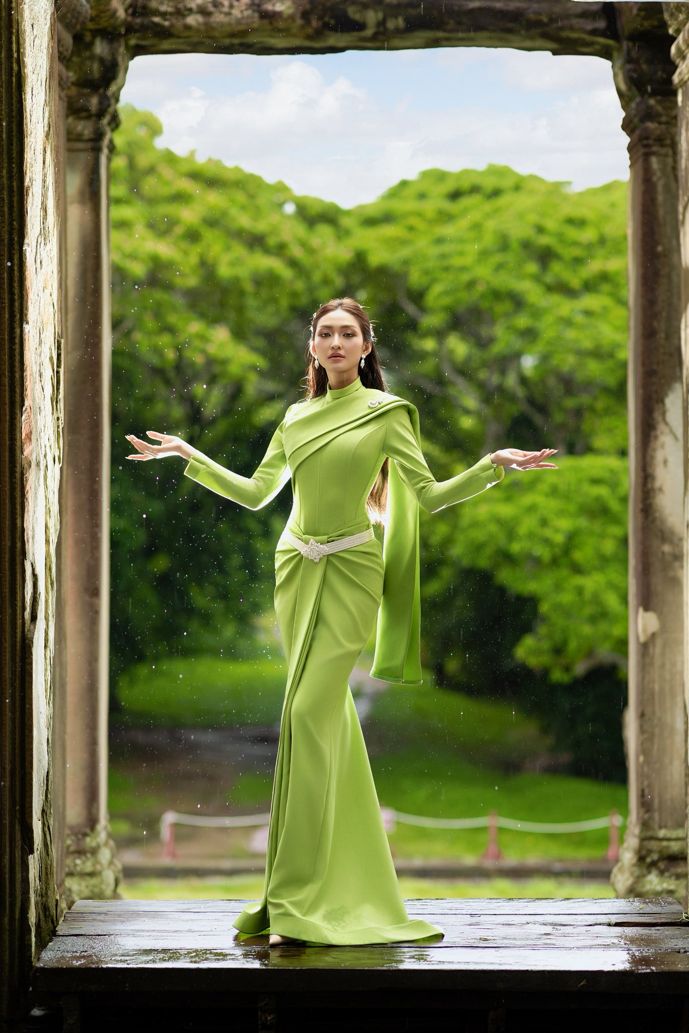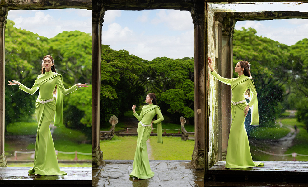 បេក្ខភាព Miss Universe Cambodia 2025 កញ្ញា ពេជ្រ វត្តីសារ៉ាវឌ្ឍី ទើបបង្ហាញរូបភាពថ្មីៗនៅលើទឹកដីអង្គរ។ ស្ថិតក្នុងឈុតសហសម័យដែលច្នៃពីកំណាត់ធម្មតា តែបែបប្រពៃណី ឃើញថា MUC 19 ស្រស់ស្អាតខ្លាំង ហើយក៏ប្លែកផងដែរ ព្រោះនាងបានជ្រើសរើសពណ៌ត្រួយចេកខ្ចី។