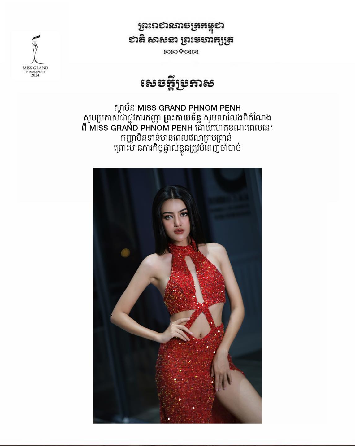 ការប្រកាស​លាលែងតំណែង Miss Grand Phnom Penh 2024 របស់ ព្រះកាយច័ន្ទ កាលពីពេលថ្មីៗ បានធ្វើឱ្យមហាជន និងអ្នកស្នេហាវិសយបវរកញ្ញាស្រងាកចិត្តជាខ្លាំង ព្រោះ​ពួកគេមានក្តីរំពឹងយ៉ាងខ្ពស់លើបវរកញ្ញាម្នាក់នេះ ក្រោយ​ឃើញសមត្ថភាព ការខំប្រឹងប្រែងរបស់នាងរយៈពេលចុងក្រោយនេះ។