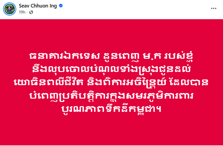លោក អ៊ឹង ស៊ីវឈន់ CEO ក្រុមហ៊ុនដូនពេញ ត្រេឌីង ឯ.ក បានប្រកាសលុបចោលបំណុលទាំងស្រុងដល់កងទ័ពដែលពលីជីវិត ស្របតាមការជូនដំណឹងពីធនាគារជាតិកម្ពុជា និងការសំណូមពរពីថ្នាក់ដឹកនាំកម្ពុជា គឺសម្ដេចមហាបវរធិបតី ហ៊ុន ម៉ាណែត នាយករដ្ឋមន្ត្រីនៃព្រះរាជាណាចក្រកម្ពុជា។